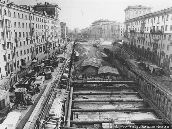 Когда строительство началось, главная транспортная магистраль столицы, Ленинский проспект (ныне проспект Независимости), под которым и проходила линия метро, стал выглядеть вот так.