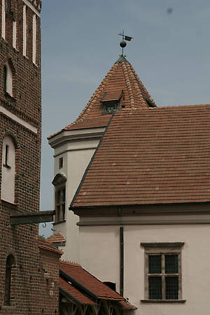 Хотя замок был чистенький, свеженький, но все-таки оставалось на душе такое ощущение, что лучше бы его не так старательно отреставрировали...После всех работ Мирский замок мне лично напомнил биоробота, в котором срощены по живому металл и плоть, старина и новодел. Ну, наверное, так и было задумано...Правда, некоторые моменты все-таки очень даже стоят того, чтобы приехать на них посмотреть. Например — лестницы в башнях. Это просто что-то потрясающее! Эти лестницы ведут от самых подвалов к самой крыше башен, выходя на каждом этаже на площадку, и они жутко узкие! Тоесть совершенно! Мой муж протискивался там с большим трудом, а вот маленькой дочке даже понравилось карабкаться по ступеньками. Хорошо, что в будни там мало народу — а то пробки неизбежны, да еще без светофоров — если сверху кто-то идет, то кому-то придется пятится назад. Все это вызывает множество веселья у посетителей, все с удовольствием гуляют по лесенкам из подвалов до крыши и обратно, хотя высота там изрядная! Башни между собой соединены деревянной галереей, хотя и новой, но очень грамотно состаренной, и поэтому хорошо вписавшейся в экстерьер замка. В самих башнях из окошек открываются шикарные виды а под крышей можно полюбоваться системой деревянных креплений.
