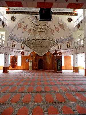 Я так аккуратно обошла его, разулась, прошла вперед. Внутри ничего особенного, чистенько, побелено, покрашено. А вот люстра мне очень понравилась! Я, кстати, поймала себя на мысли, что ни разу ни в одной мечети не видела зажженных люстр. Может я просто по ночам там не хожу?)
