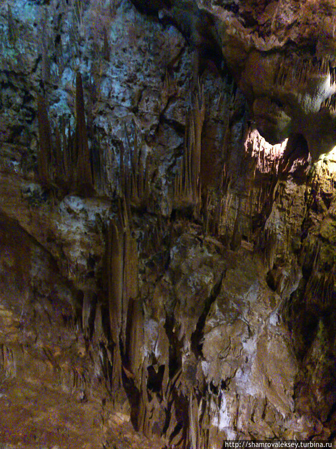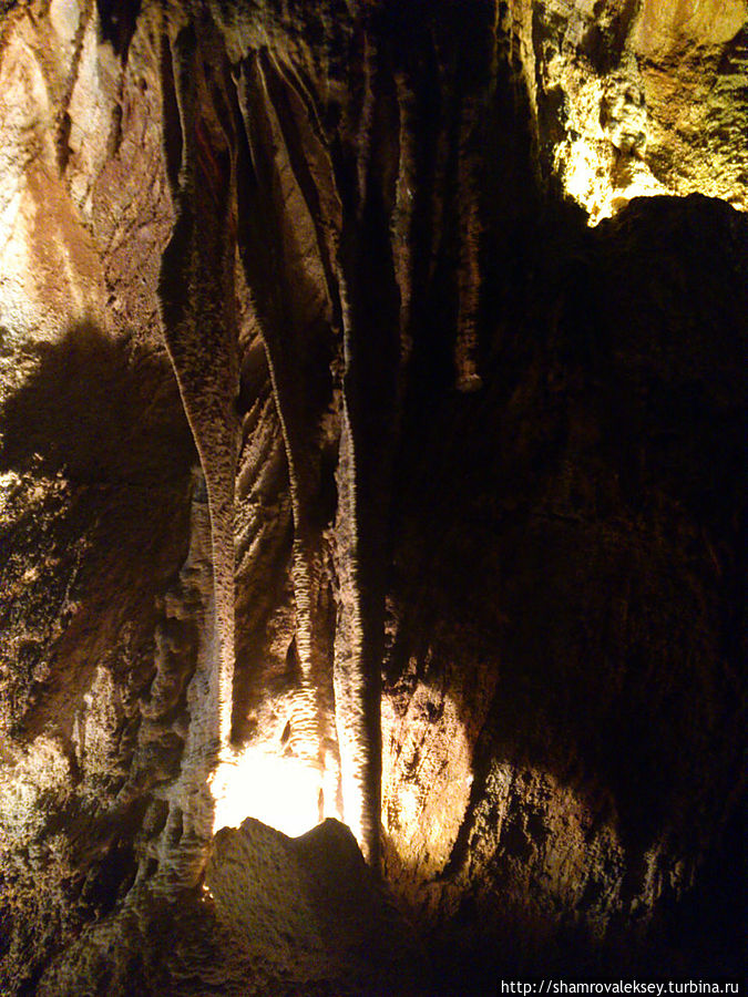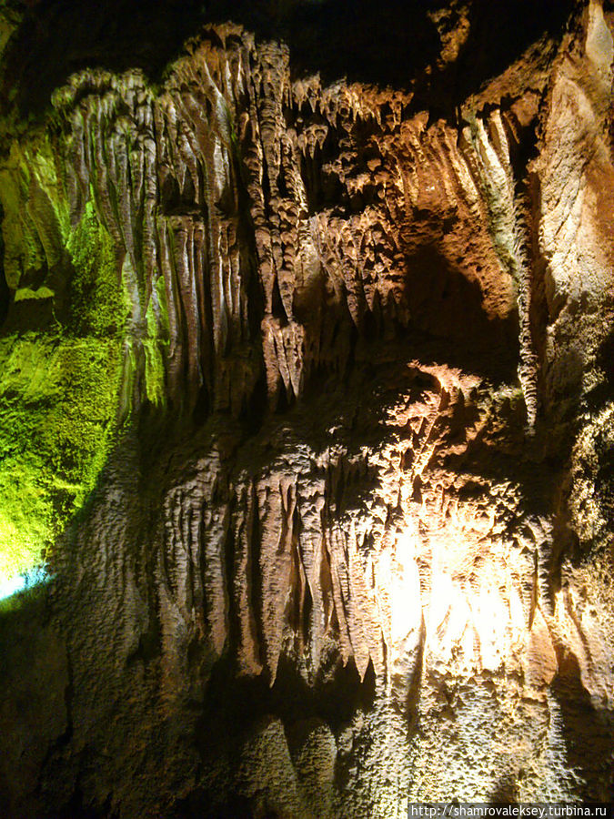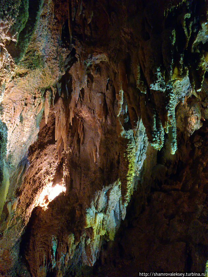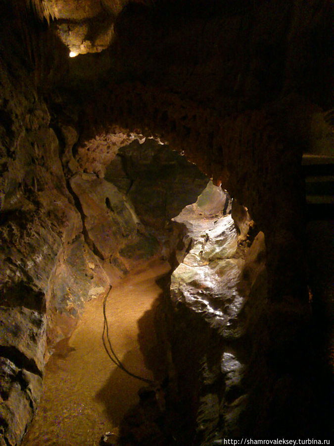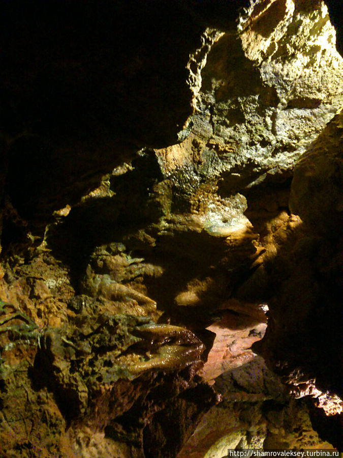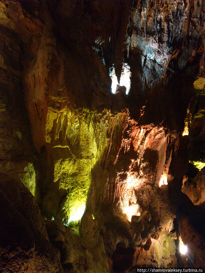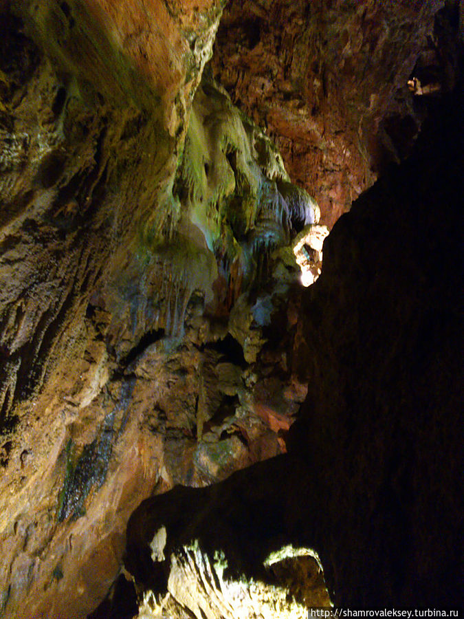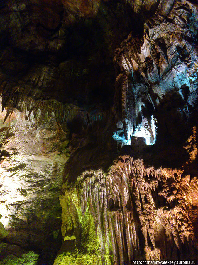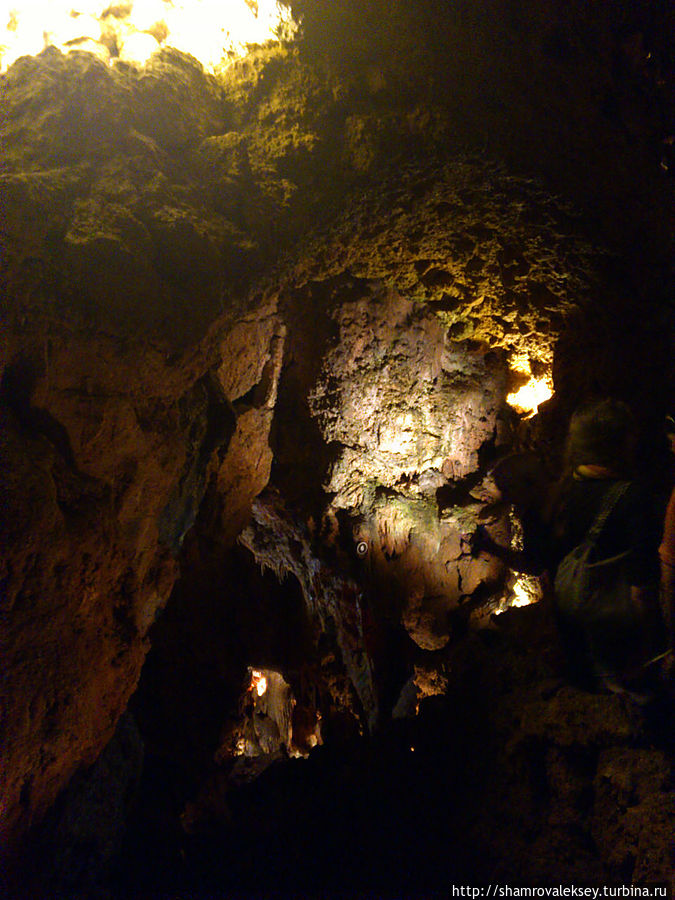 Эти красивые пещеры признанные в результате общепортугальского опроса одним из семи природных чудес Португалии опускаются в глубь Воздушных гор Мира де Айре на 110 метров. Величественное творение природы было открыто в 1947 году пастухами из одноимённого городка Мира де Айре у которых постоянно пропадали овцы. Во время очередного поиска они открыли провал вёдший в глубокую пещеру, стены и своды которой были заполнены огромным количеством разнообразных по форме и размерам сталактитов и сталагмитов. Медленно растущие друг навстречу другу минеральные отложения известняка встречали меня на всём протяжении спуска по серпантину искусственных лестниц устроенных в теле пещер. Разноцветная подсветка пещер добавляет волшебства и красочности природным структурам и фонтанам устроенным человеком в нижней части пещер ставшим истоком Чёрной реки. Общая разведанная длина пещер составляет более 10 километров, я же смог увидеть только малую часть пещер открытых для посещения с 1974 года.
