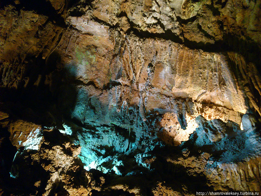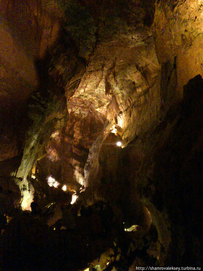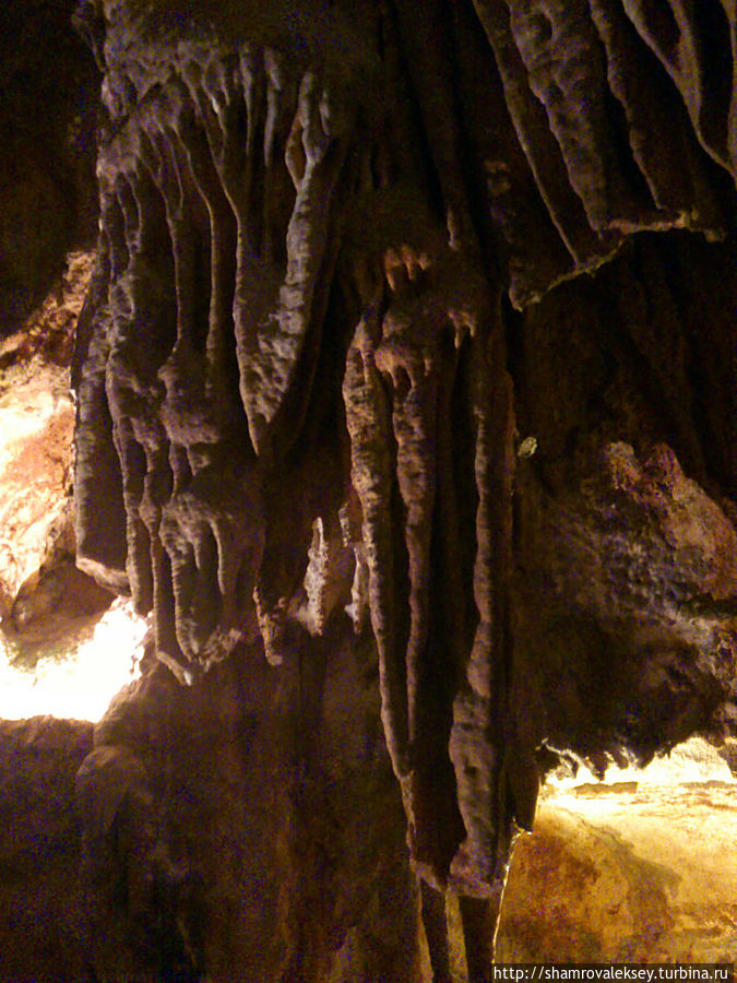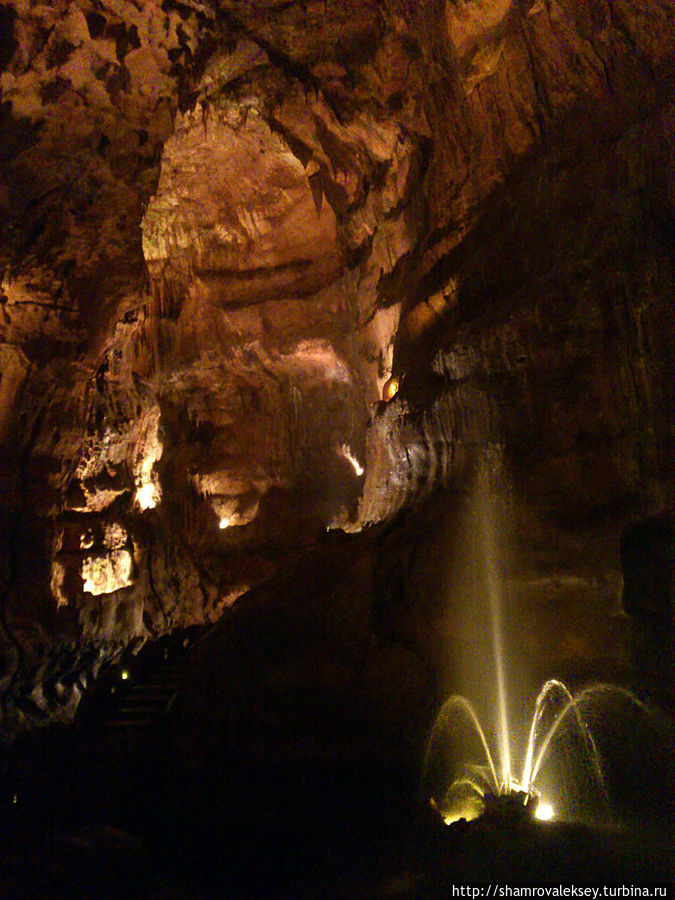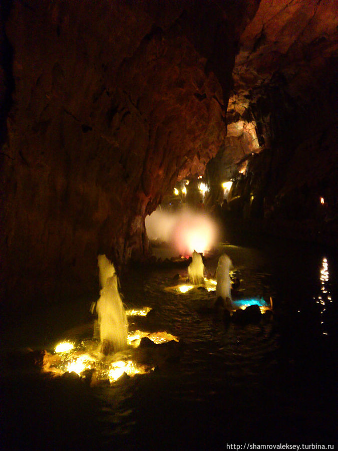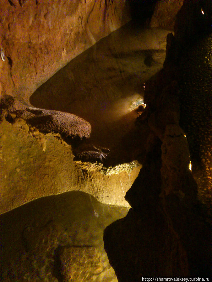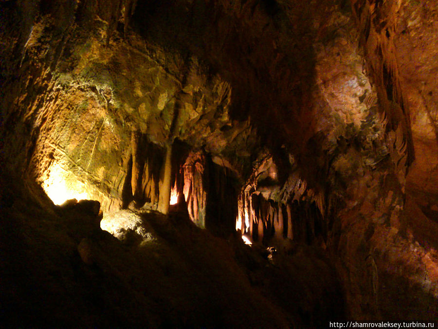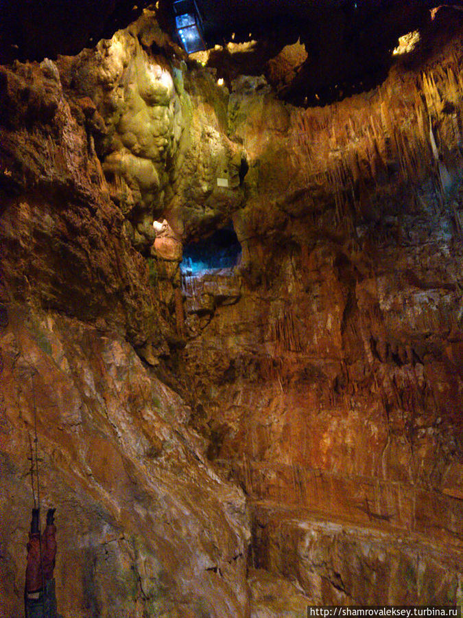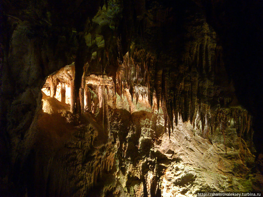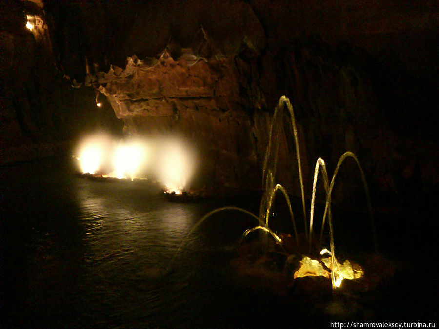 Эти красивые пещеры признанные в результате общепортугальского опроса одним из семи природных чудес Португалии опускаются в глубь Воздушных гор Мира де Айре на 110 метров. Величественное творение природы было открыто в 1947 году пастухами из одноимённого городка Мира де Айре у которых постоянно пропадали овцы. Во время очередного поиска они открыли провал вёдший в глубокую пещеру, стены и своды которой были заполнены огромным количеством разнообразных по форме и размерам сталактитов и сталагмитов. Медленно растущие друг навстречу другу минеральные отложения известняка встречали меня на всём протяжении спуска по серпантину искусственных лестниц устроенных в теле пещер. Разноцветная подсветка пещер добавляет волшебства и красочности природным структурам и фонтанам устроенным человеком в нижней части пещер ставшим истоком Чёрной реки. Общая разведанная длина пещер составляет более 10 километров, я же смог увидеть только малую часть пещер открытых для посещения с 1974 года.