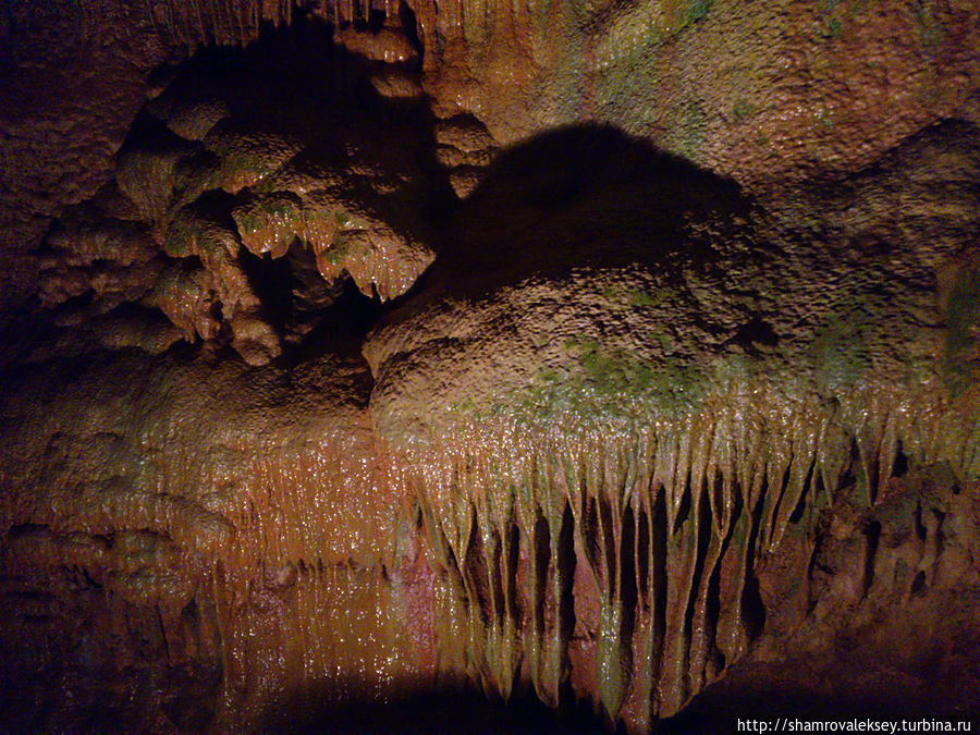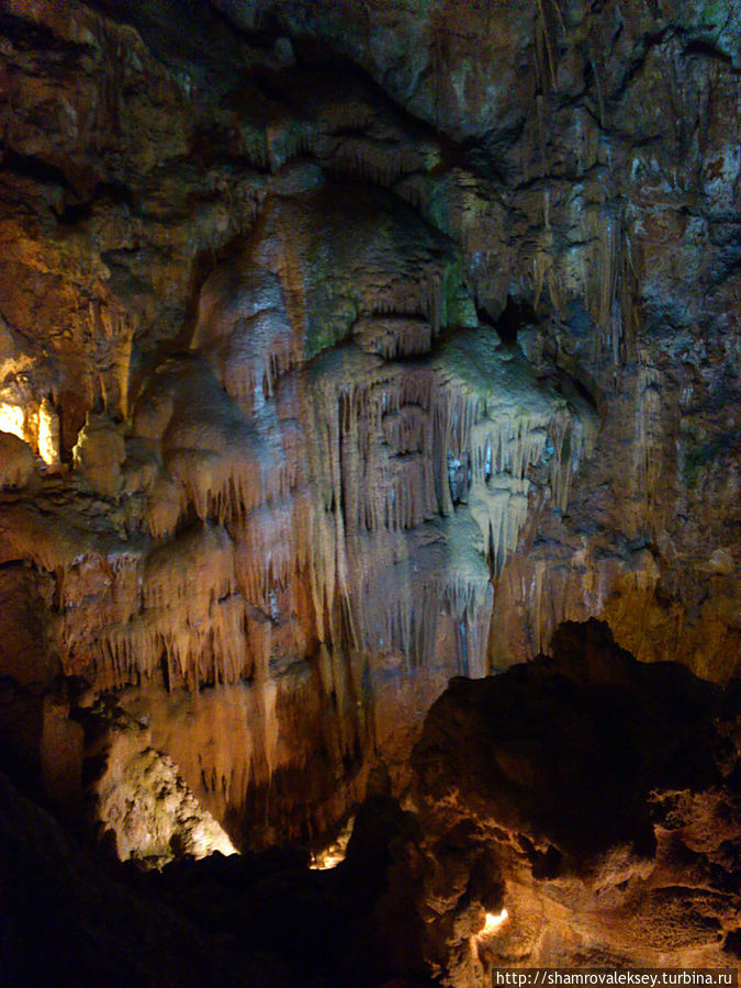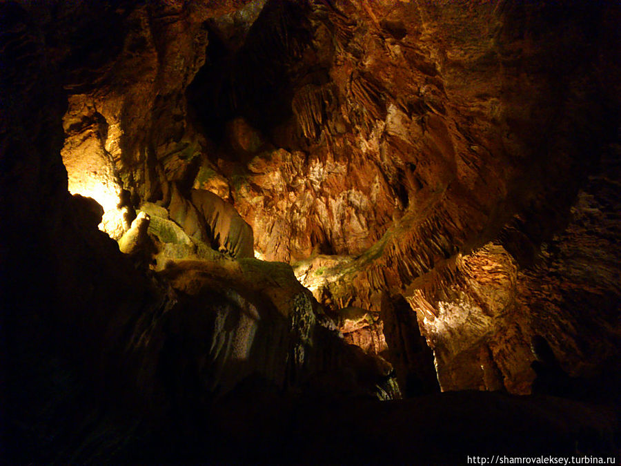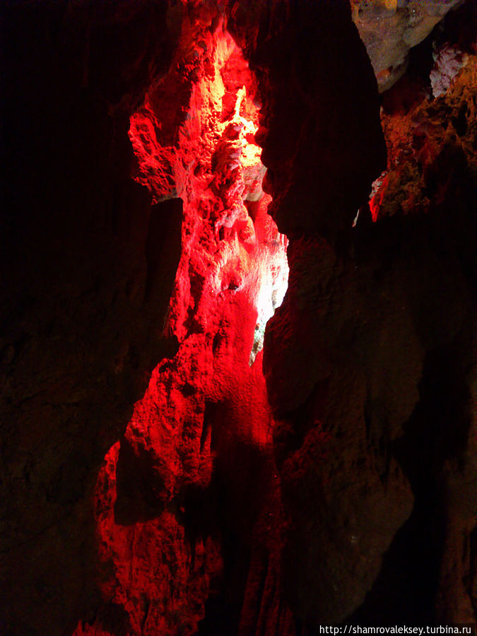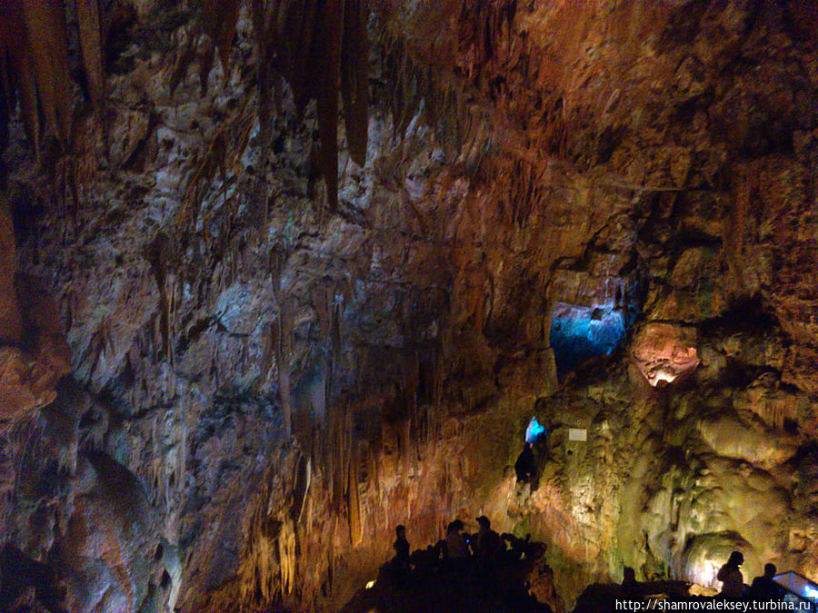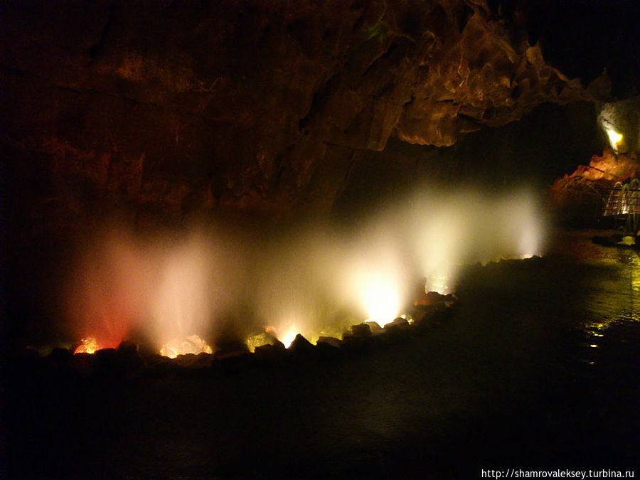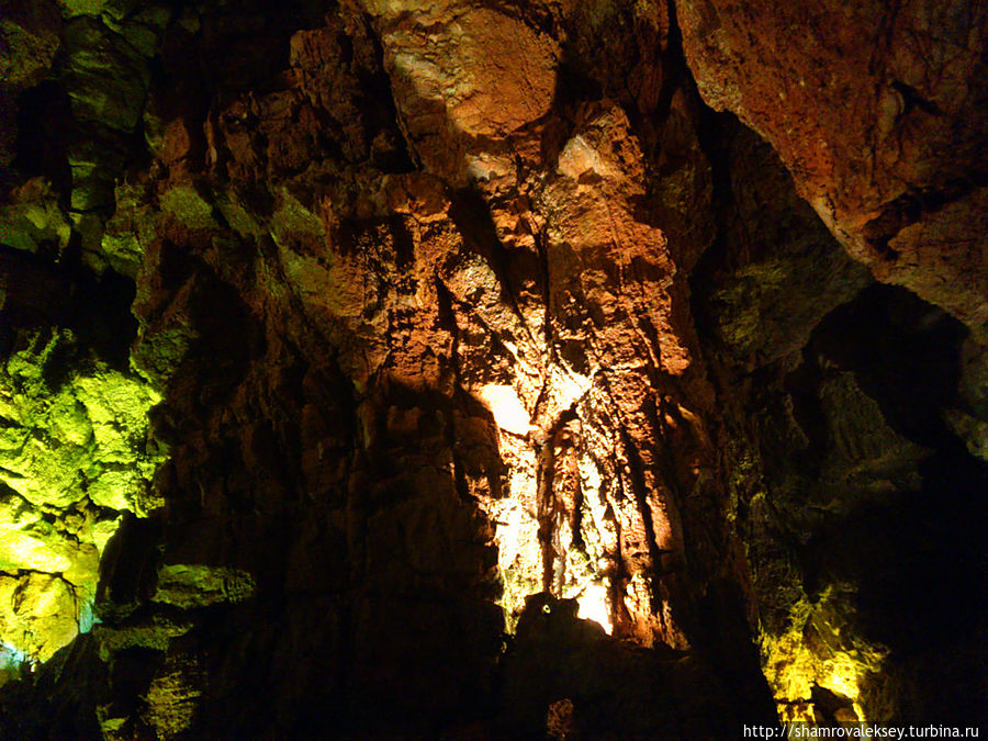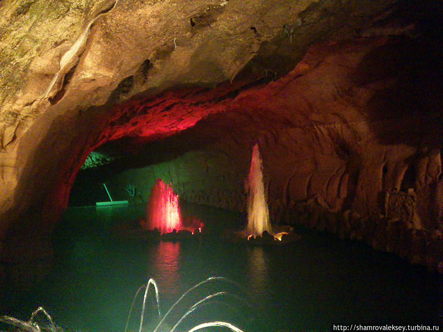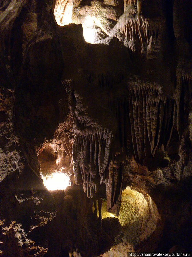 Эти красивые пещеры признанные в результате общепортугальского опроса одним из семи природных чудес Португалии опускаются в глубь Воздушных гор Мира де Айре на 110 метров. Величественное творение природы было открыто в 1947 году пастухами из одноимённого городка Мира де Айре у которых постоянно пропадали овцы. Во время очередного поиска они открыли провал вёдший в глубокую пещеру, стены и своды которой были заполнены огромным количеством разнообразных по форме и размерам сталактитов и сталагмитов. Медленно растущие друг навстречу другу минеральные отложения известняка встречали меня на всём протяжении спуска по серпантину искусственных лестниц устроенных в теле пещер. Разноцветная подсветка пещер добавляет волшебства и красочности природным структурам и фонтанам устроенным человеком в нижней части пещер ставшим истоком Чёрной реки. Общая разведанная длина пещер составляет более 10 километров, я же смог увидеть только малую часть пещер открытых для посещения с 1974 года.