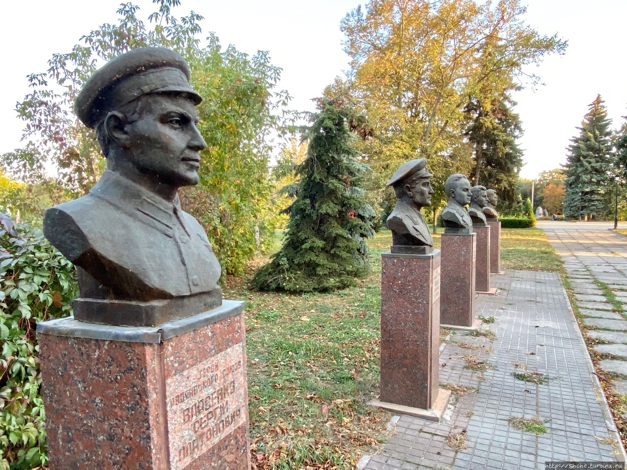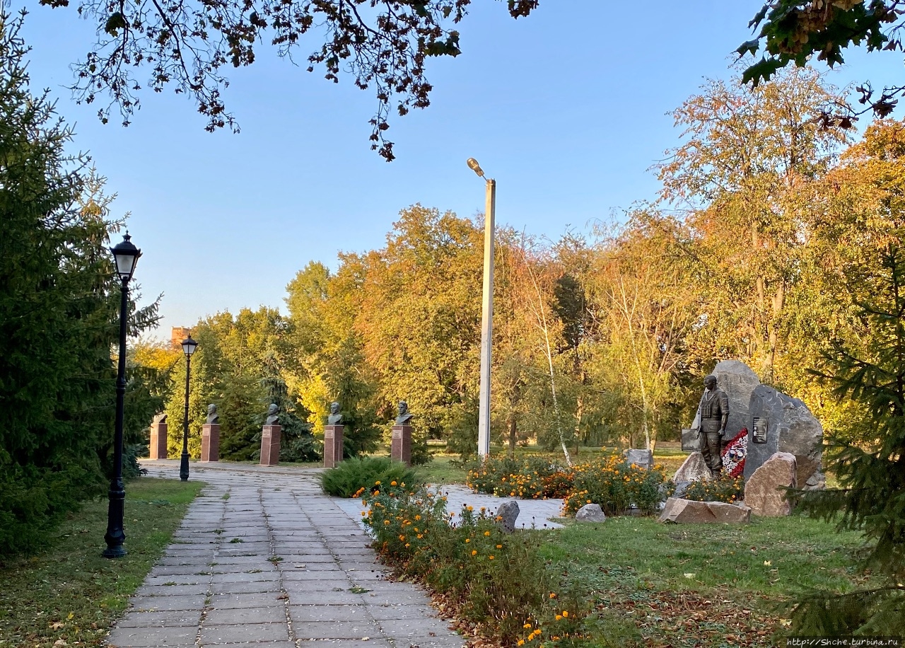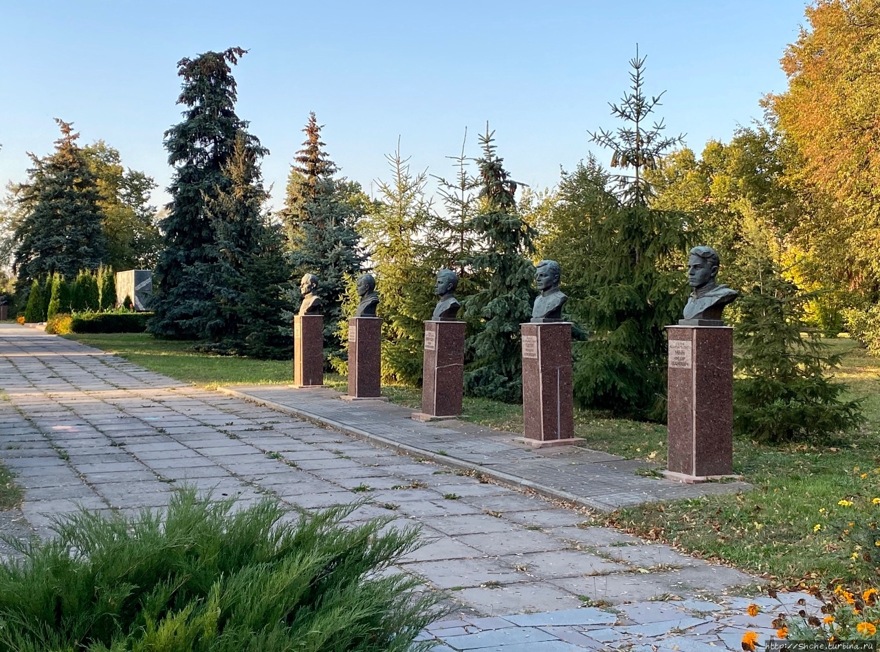 Миргородцы при создании парка Славы не ограничились общей стеллой и примитивным мемориалом. Они установили бюсты Героев Советского Союза, по пять с левой и правой стороны от центра.