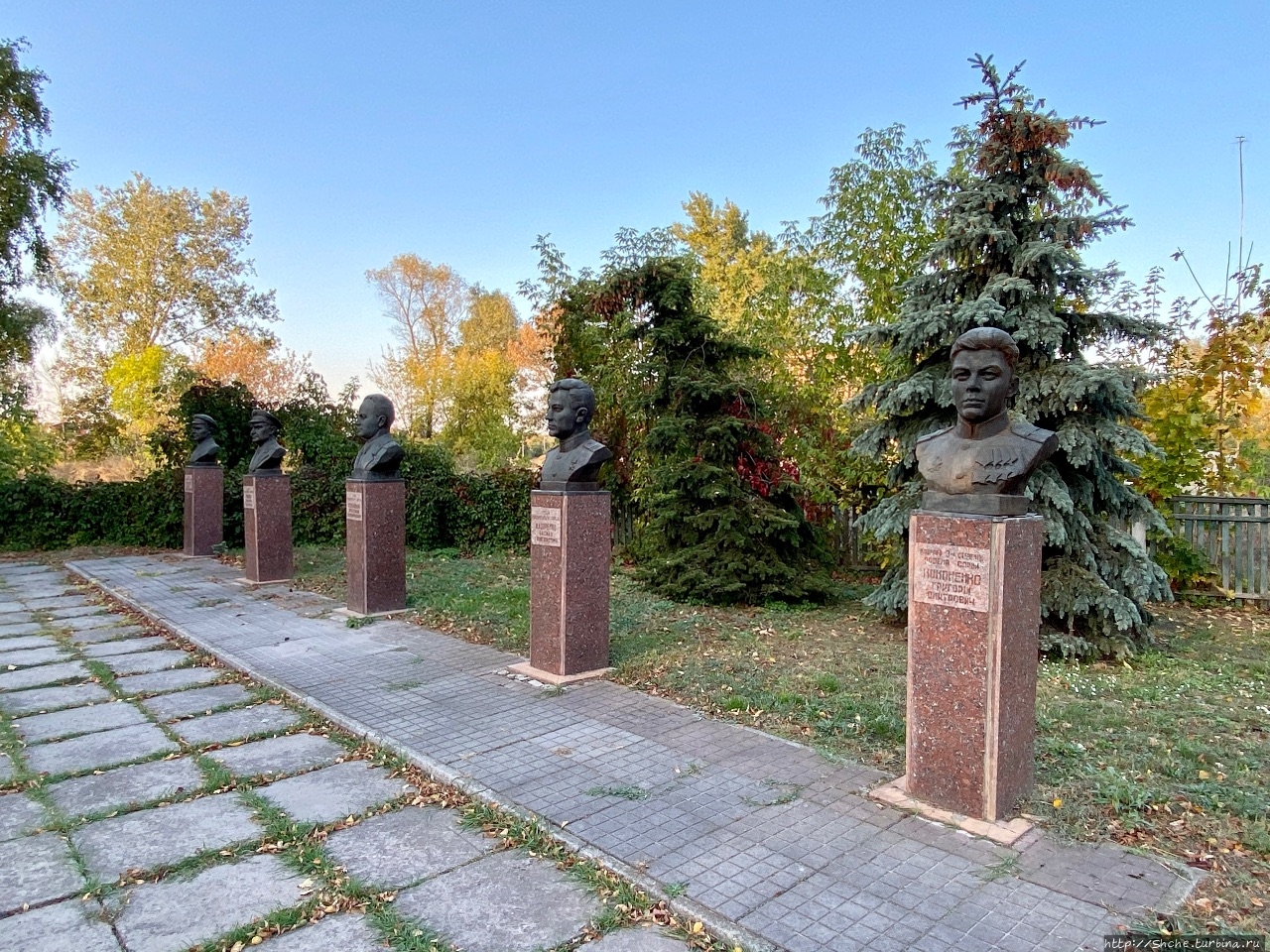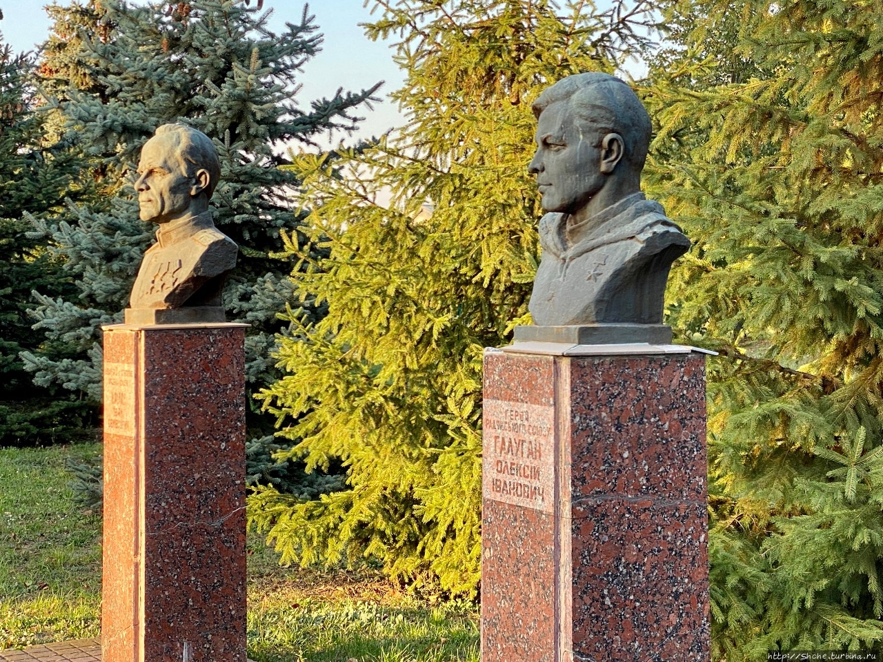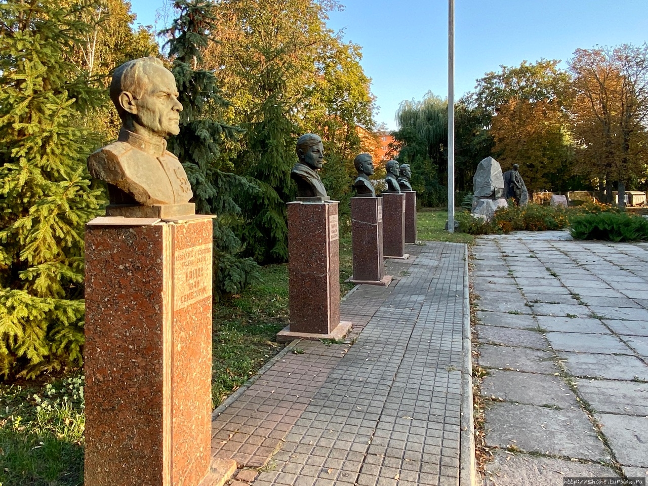 Миргородцы при создании парка Славы не ограничились общей стеллой и примитивным мемориалом. Они установили бюсты Героев Советского Союза, по пять с левой и правой стороны от центра.