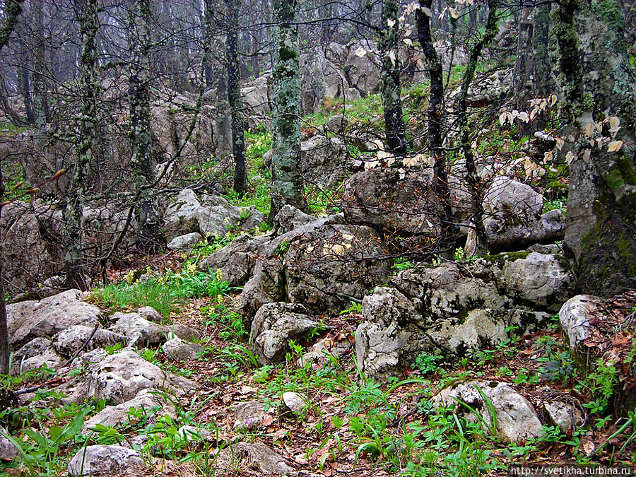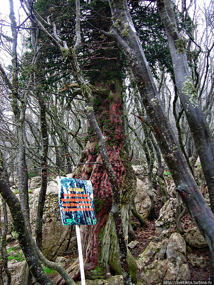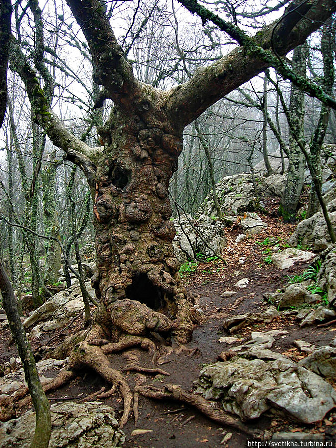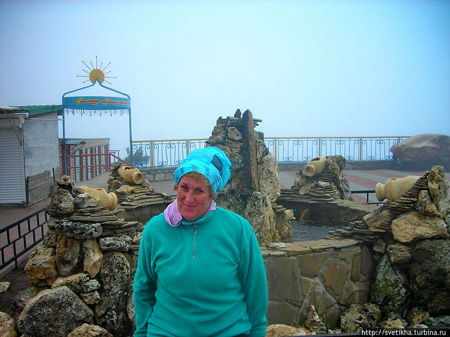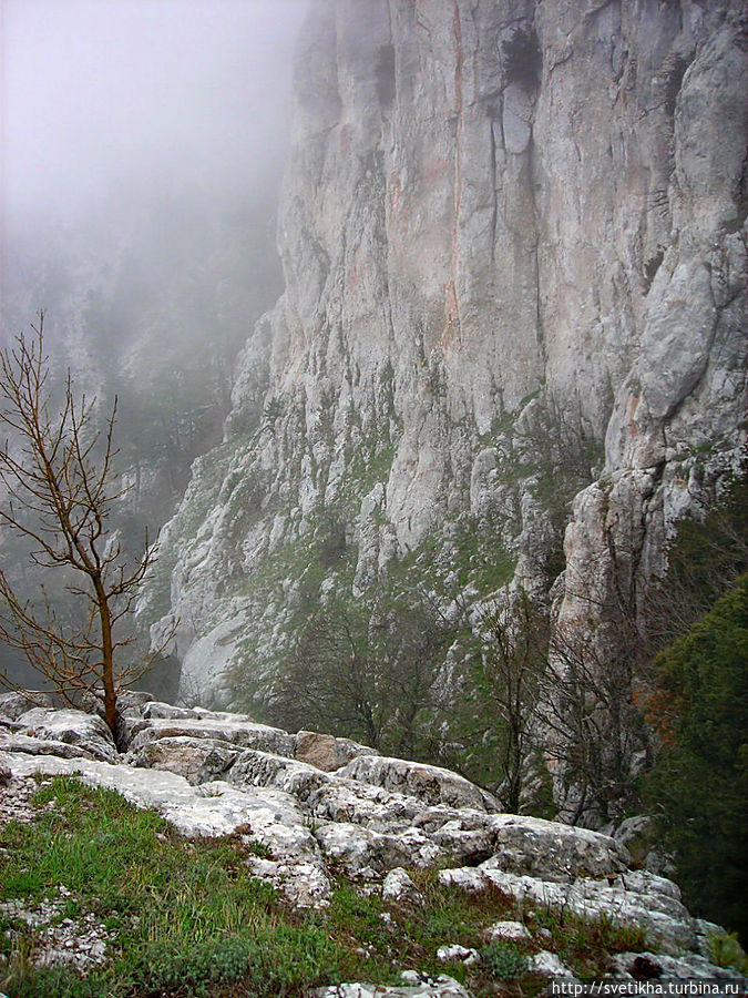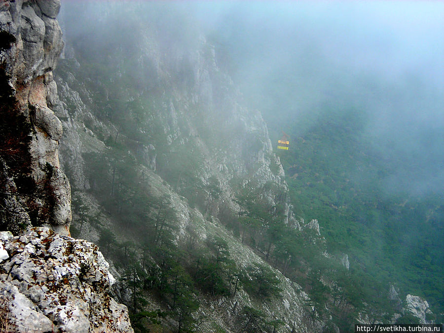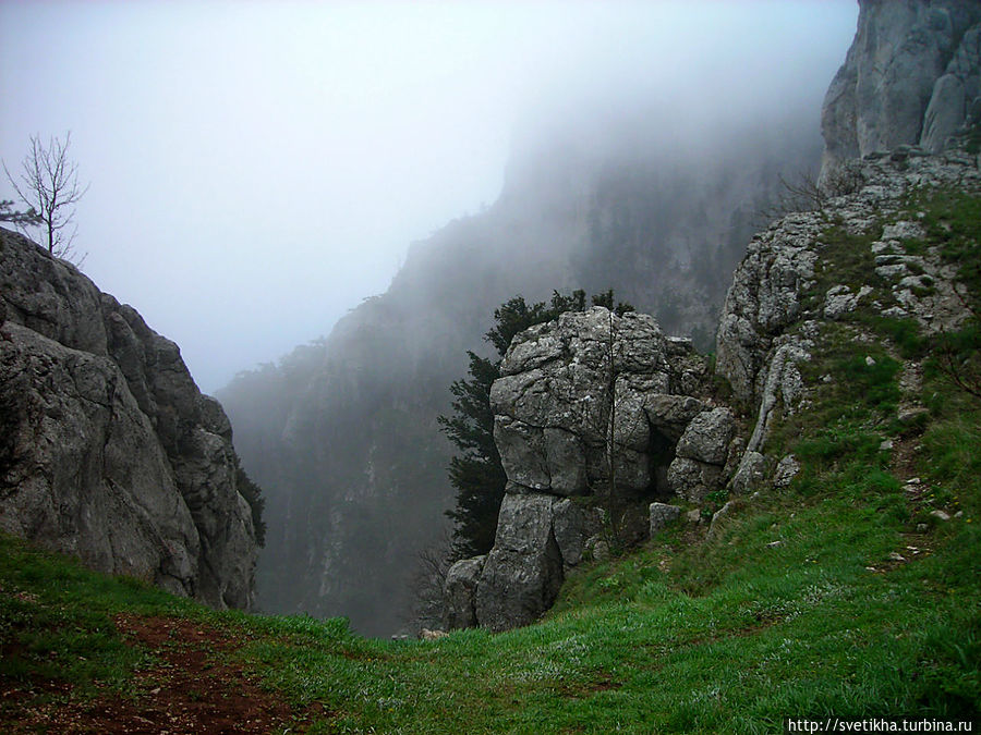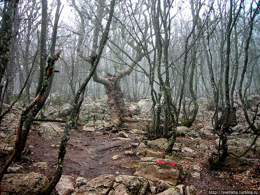 На горе миги город- здесь кафешки с вкусной крымской кухней,катание на верблюдах, осликах и много национально утвари. Так что берите денежки и не забудьте теплую одежду.Меня Ай Петри встретил ветром и туманом.Когда приедете на гору, далее пешком на высшую точку массива-гора Рок.Куда я и отправилась в гордом одиночестве, так как экскурсий в это время не было.Я шла по чудному сказочному лесу, с причудливыми старыми деревьями было страшновато и казалось, что вот-вот проявиться леший. Так все была необычно и неожиданно.В лесу есть указатели, так что не заблудитесь.Минут через 40, я была на вершине. Такая благодать.Легла на траву и никуда не хотела двигаться. Мое уединение нарушила парочка, которые кстати появились и запечатлели меня на вершине