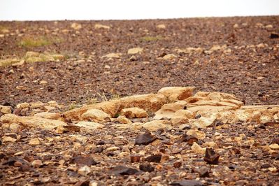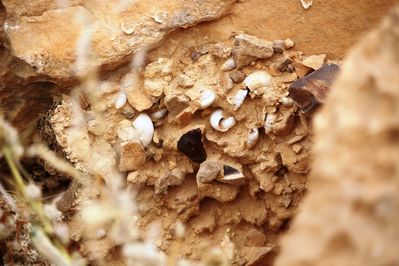 На горе просто россыпи кремня. Крепкого качественного, темно-коричневого. Кое-где просто видно, как он вкраплен в розоватый от времени известняк.