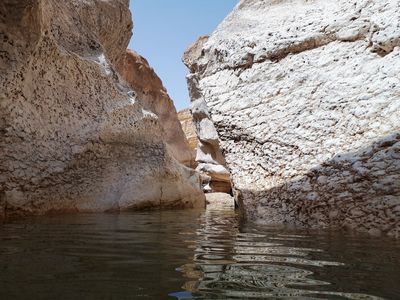Ну, вот и я уже достигла дна, чем дальше, тем уровень воды ниже. Мы дошли до сухого берега и вернулись обратно. Пока наши друзья проходят каньон, отдыхаем и вспоминаем.