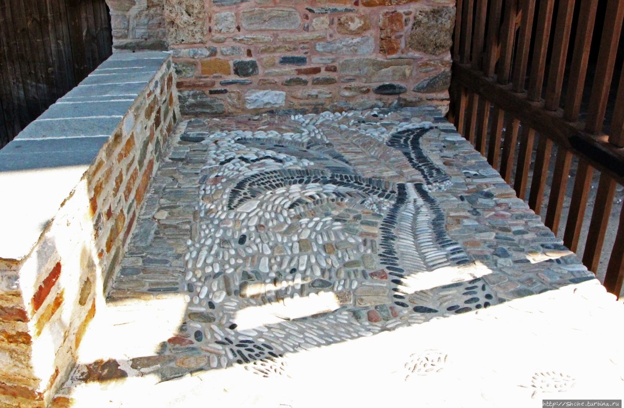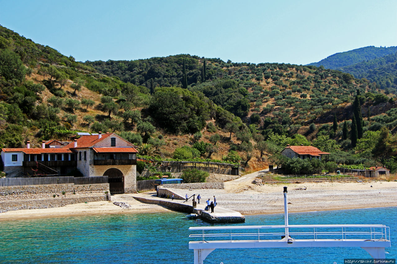 Паром, который доставляет посетителей из города Уранополис в монашеское государство, идет вдоль западного берега полуострова, и делает остановки возле всех монастырей, расположенных на этой стороне. Первая остановка у причала монастыря Зографа, но сам монастырь находится в горах, потому мы его так и не увидели...