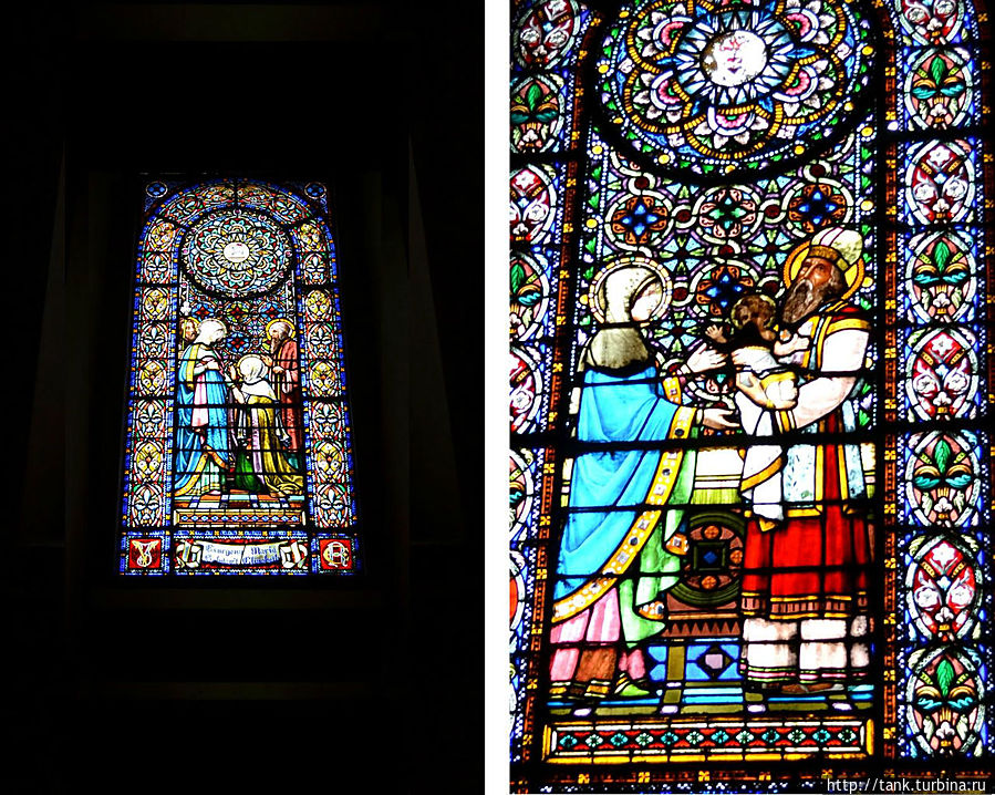 В соборе паломники медленным шагом движутся через украшенные капеллы, свет в которые попадает через разноцветные витражи.