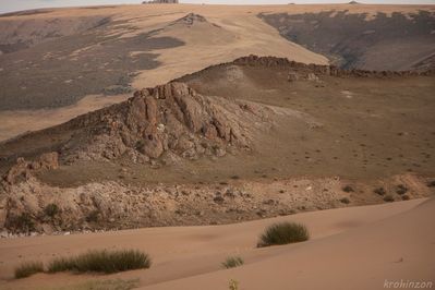 Жёлтые, изрезанные графичными линиями теней, стены Монгол Элса сопровождали нас целый день. Трудно представить: взять, к примеру, и засыпать всё от Москвы до Ярославля песком километров на сорок вширь – неслабая такая песочница. Двигаясь к Хяргас нууру, мы проезжали Эрдэнэхайрхан, Завханмандал и Ургамал. Кажется, в Ургамале мы встретили команду весёлых ребят из Кемерово. Они тоже уже шли на выход, и далее мы ещё не один раз пересекались с ними.