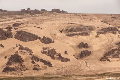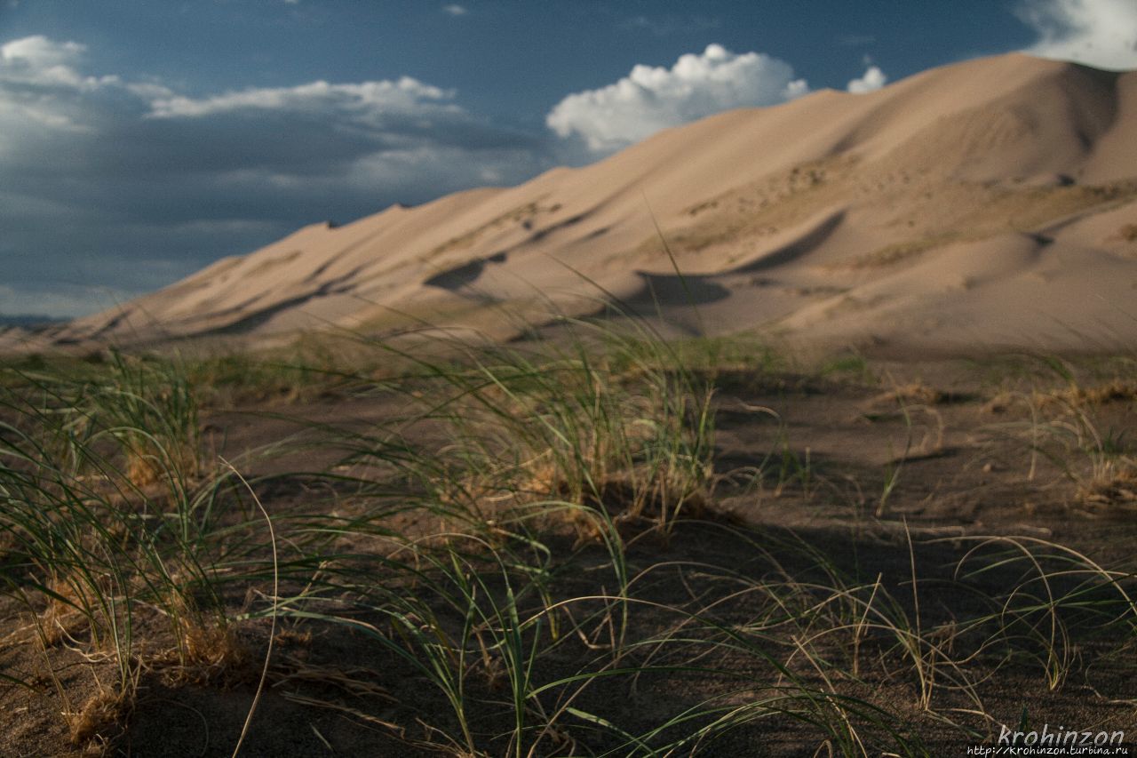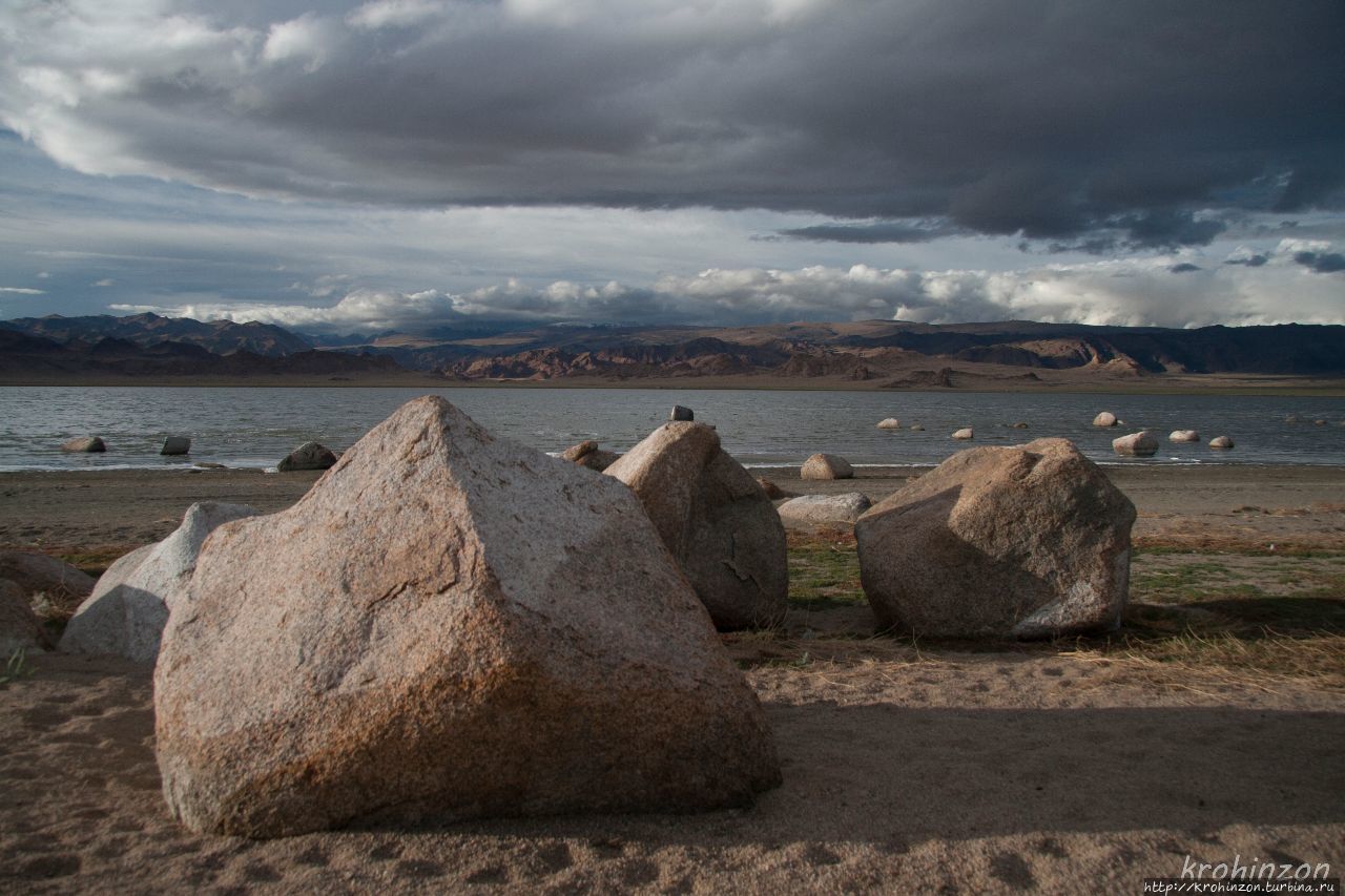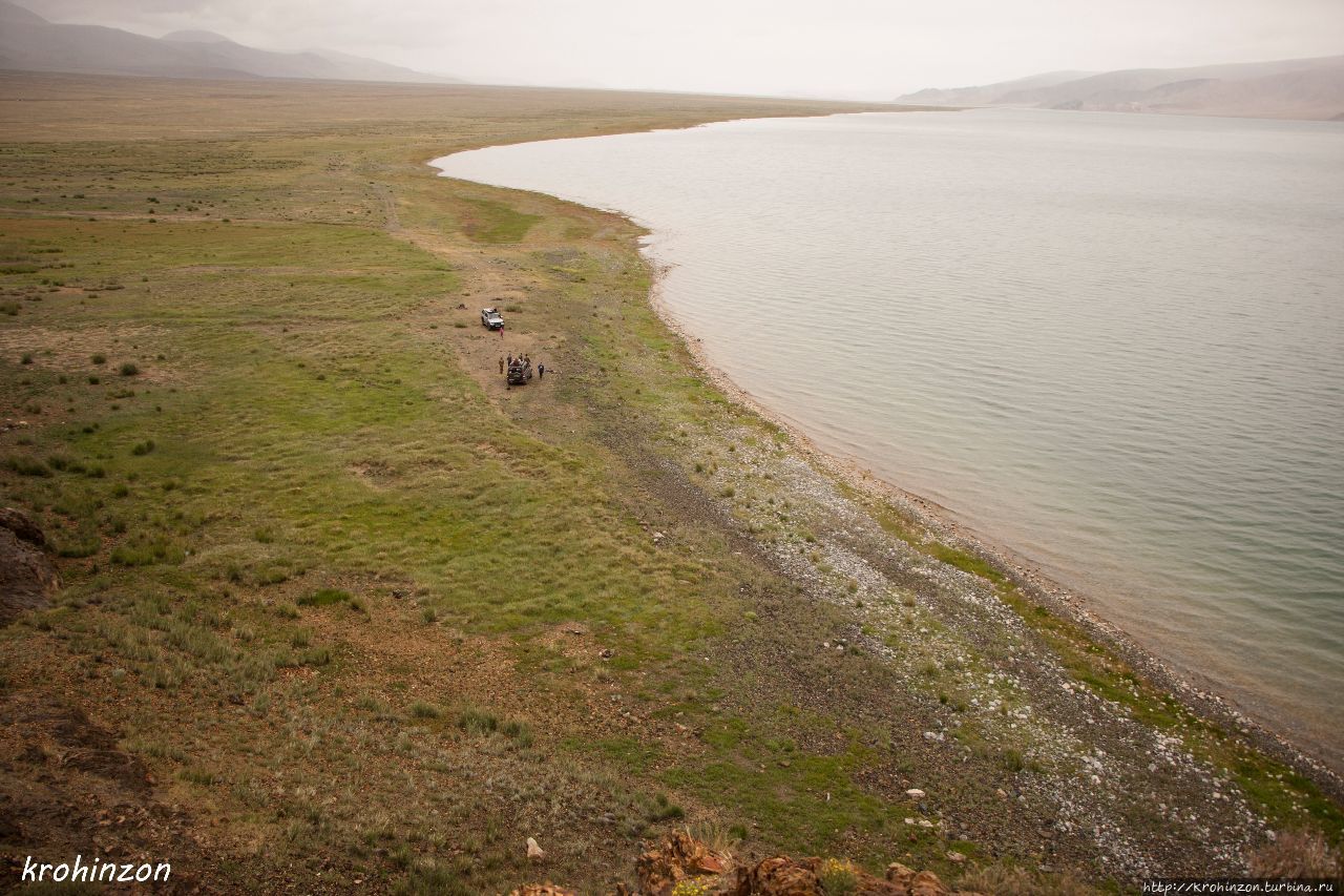 Озеро фантастической красоты. Его окружают горы. Только при ближайшем рассмотрении ты понимаешь, что горы эти не каменные, а песчаные. Это край гигантского песчаного массива Монгол Элс, который растянулся аж на двести километров. Сложно понять, песок ли наносится ветрами, обволакивая горы, или вершины, как сказочные богатыри, пытаются вырваться из-под укрывшего их песчаного покрова. А озеро лежит у ног этих гор и ослепляет твои глаза ярким цветом. У берега оно ещё жёлтое, дальше становится бирюзовым и постепенно уходит в ярко синий. И огромный песчаный бархан вдаётся в озеро, пытаясь разделить его на две части.