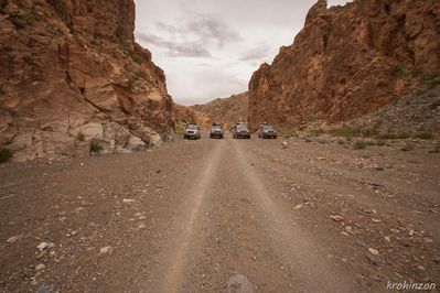 Но нам надо дальше. От Хар нуура мы не идём по дороге, обозначенной тонкой ниткой на карте – мы идём по дорожке, которой на карте нет. Лезем в перевал. Петляем между камнями. Опускаемся в маленькую долину. Песчано-каменные горы сопровождают нас. А вон там, видите, слева, в крутую гору пошла дорога? Нам явно не туда. Непонятно, для каких ненормальных накатана эта дорога. Дальше, дальше. Мы забираем левее и оказываемся у дороги, которая явно накатана для каких-то ненормальных, которая идёт не привычными галсами, набирая высоту постепенно, а тупо, в лоб, напрямки.