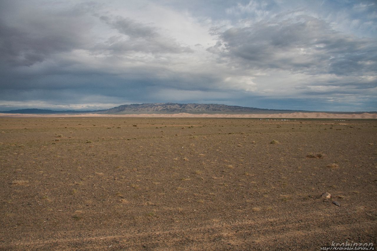 А дальше мы ехали по впадине Нэмэгэт. Википедия говорит мне, что впадина зажата между двумя довольно высокими – в районе 2,5 тысяч метров – хребтами, но масштабы пространств таковы, что ты не чувствуешь, как высоки горы. Место это известно тем, что там найдены ископаемые кости динозавров, а посему, называется оно ещё и «кладбищем динозавров». Окружающие виды рождают такие диалоги: