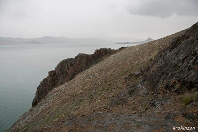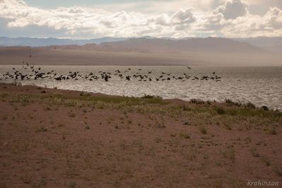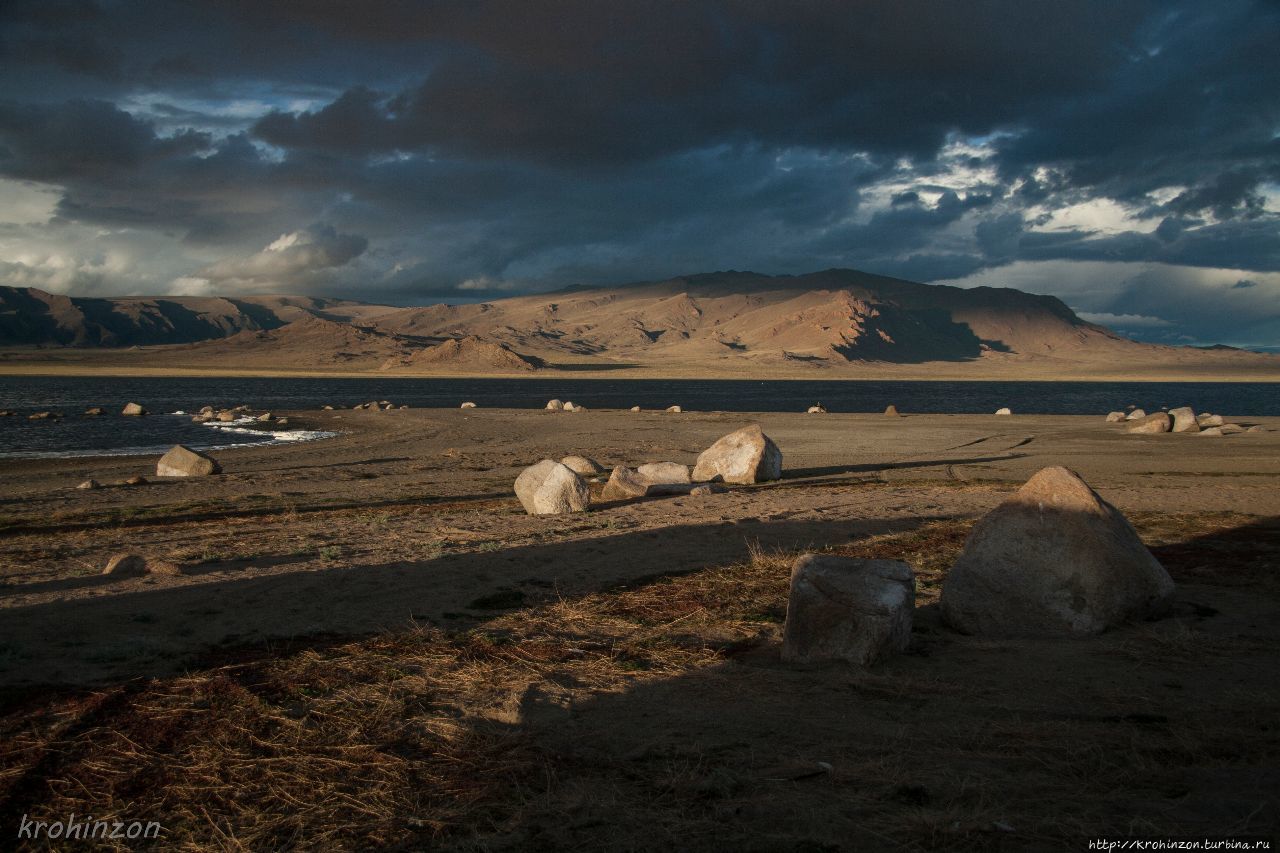 От Улгия мы шуршим по асфальту в сторону озера Толбо-Нуур. Говорят, оно очень яркое. Возможно. Но мы не заметили. Озеро было свинцовым, небо было свинцовым, а окружающие скалы были черно-коричневые. Что, конечно же, не помешало нам и полазить по горам и искупаться в озере – в свинцовости есть своя прелесть.