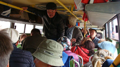 Пришло время «поселяться» в наш дом-автобус на ближайшие 1,5 суток. Как он называется, не знаю, но очень похож на русский «ПАЗ». При попытке войти через переднюю дверь мы обнаружили в салоне уже около 40 «жильцов», эти были монгольские казахи. Проход был забит вещами настолько, что пассажиры добирались к своим местам ползком прямо по баулам. Несмотря на это обстоятельство, а также на неприятные запахи, все были довольны и никто не возмущался.