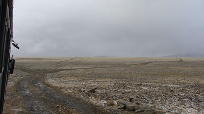 По дороге «тойота» глохла два раза и это дало возможность выйти на улицу, чтобы сфотографировать дикую природу, на фоне которой гуляли стада яков и табуны лошадей. Очень скоро дорога превратилась в направление шириной около 500 метров, где водитель может выбрать одну из многочисленных заезженных колей или сделать свою собственную. Поездка по монгольской степи больше похожа на сафари, чем на движение по трассе.