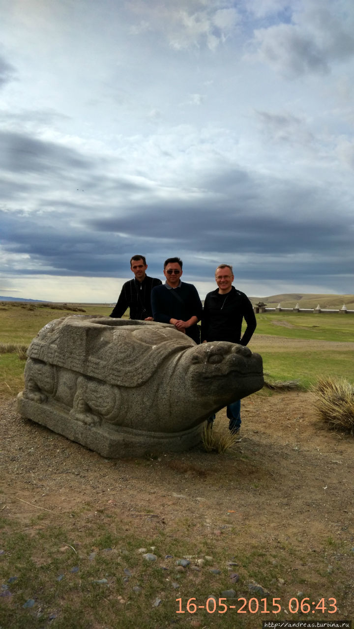 По возвращении в Хархорин мы заехали осмотреть развалины древнего города Каракорума. Он был столицей Монгольской империи в 1220 – 1260 годах. Но сегодня от столицы древнего царства остались только руины фундамента и знак, сообщающий о древнем городе. Также сюда зачем-то привезли каменную черепаху весом в несколько тонн.