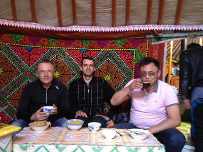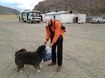 После Кобды горная степь сменилась горной пустыней Гоби, дорога отсутствовала, здесь каждый едет, как ему вздумается. Уже второй день мы находимся на высоте около 2 000 метров. Оказалось, что Олег и Серик страдают высокогорной болезнью и им плохо, они почти не едят и постоянно хотят спать. Чем дальше, тем чаще автобус начал ломаться. Уже в полночь еле доплелись до города Алтай. Там встали на двухчасовый ремонт, поэтому мы засели в ближайшем кафе за чаем и покушать манты. И, конечно же, обсудить планы нашей экспедиции. Пока что мы изнутри наблюдаем жизнь алтайских казахов, потомков древних тюрков.
