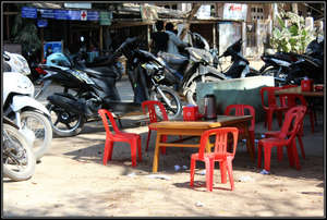 Потом появился тенистый бульвар, по которому истово хотелось прогуляться. Потом оживленная улица перед школой, по которой носилось столько велосипедов, сколько я давно не видела. А затем и сам автовокзал, который оказался обычной улицей с десятком компаний, предлагающих перевозки, куда угодно. Нам надо было в Моньву. 2000 джет, и билет на минибас в кармане. Оставался час, мы прошлись по рынку, улыбнулись молоденьким медсестрам, перекусили в кабаке с маленькими стульями. Тут очень любят дурацкие сериалы. Мы уже с парочкой познакомились в автобусах и кабаках.