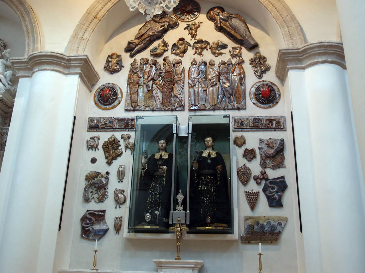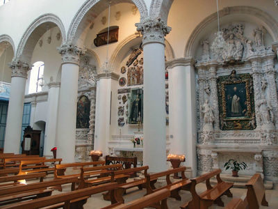 В церкви хранятся древние статуи Космы и Дамиана, а кроме того, сюда стоит зайти, чтобы посмотреть на великолепные алтари из туфа с лепниной, выполненные искусными мастерами из города Лечче.