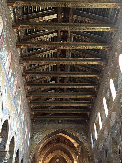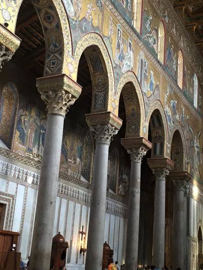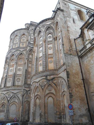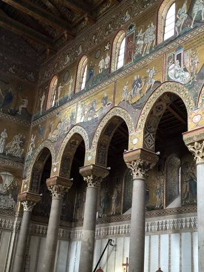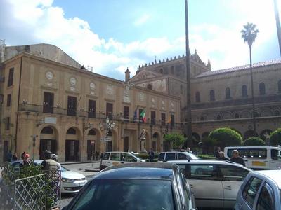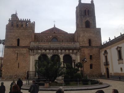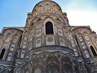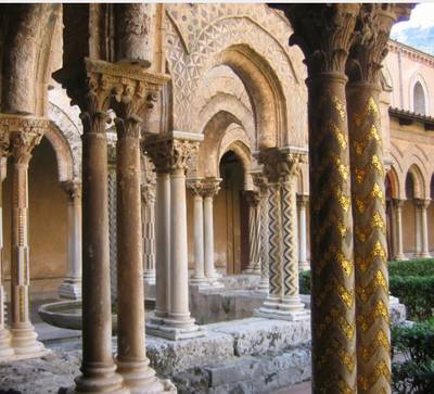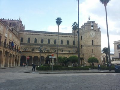 ''Cattedrale di Santa Maria Nuova di Monreale'' построен в период с 1172 года до 1267 год в стиле ''arabo, normanna, bizantino'' по желанию сицилийского Короля Guglielmo secondo di Sicilia — buono (1153 — 1189 год). Родители Короля были сицилийские монархи: Король — отец Guglielmo primo il Malo и Королева — мать Margherita di Navarra. В 1166 году после смерти Короля — отца Guglielmo secondo di Sicilia стал Королём и взял правление над всей Sicilia. По сицилийской легенде Король однажды был на охоте в лесу около города Monreale и заснул под деревом ''carrubo''. Во сне ему явилась Пресвятая Дева Мария и сказала: ''На том месте где сейчас ты спишь спрятано большое сокровище. Найди золото, выкопай и построй собор в мою честь''. Проснувшись Король перекопал всё вокруг дерева и нашёл сокровище с золотыми монетами. Вернувшись в город Король приказал начать строительство собора Cattedrale di Santa Maria Nuova. В 1811 году случился пожар в зале собора. После этого в период с 1816 года до 1837 год была проведена реставрация собора. В 2015 году 3 июля ''Cattedrale di Manreale'' внесён в список UNESCO.