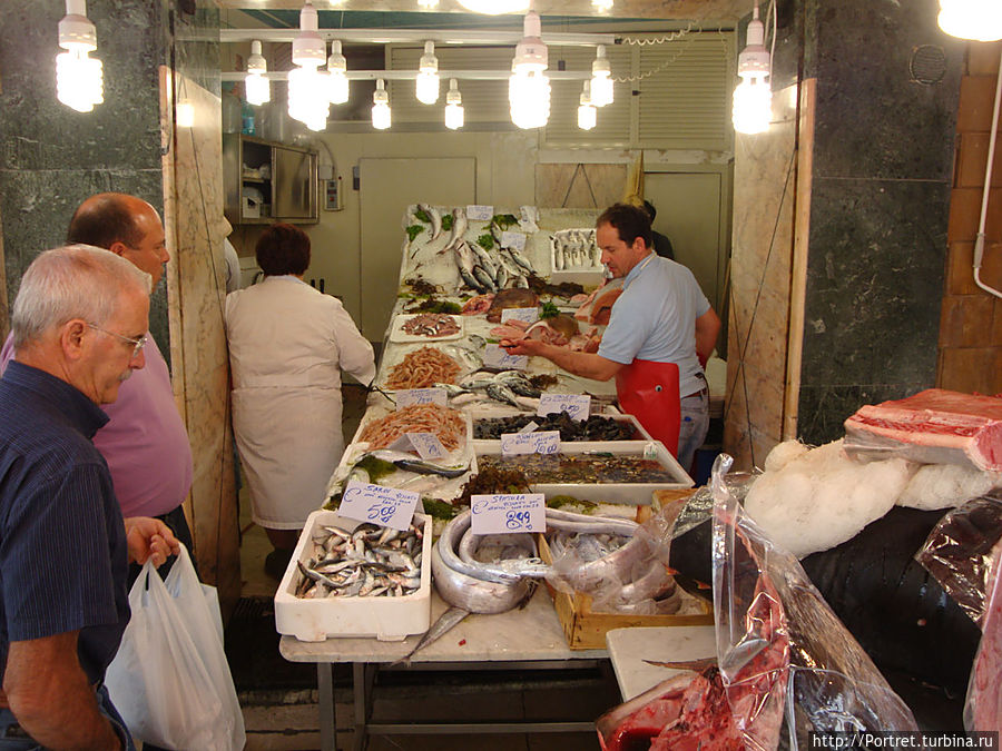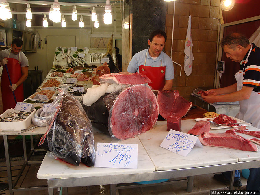 Туристы сразу же, ступив на вымощенные гранитными плитами тротуары, начинают вертеть головами, дабы не упустить ни одной детали архитектурной неповторимости зданий и городского быта. Вот синьора почтенного возраста вывешивает на балконе свежевыстиранные простыни и полотенца. При этом она успевает обсуждать житейские проблемы со своей приятельницей, стоящей внизу на тротуаре. Дальше, на лотках под навесами, расположились торговцы дарами моря. Рыба выловлена утром и прямо из порта доставлена на продажу. Продукция на любой выбор и кошелек. Есть и по два евро, и по пять, и по десять. Для гурманов и более состоятельных — тунец, почти по 18 евро за кг. Очереди из желающих полакомиться деликатесом немного. Значительно больше фото-гурманов, которые увековечивают себя на фоне огромной рыбы.