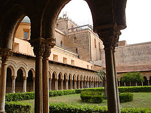 Кафедральный собор был построен по велению короля Вильгельма II в 1172 – 1176 гг. Больше всего поражает интерьер собора: его стены декорированы мозаиками, с использованием большого количества золота. Это самое полное в мире собрание традиционной византийской мозаики. Здесь представлены библейские сюжеты. Монреале может похвастаться самым большим набором византийских мозаик в Италии — всего 6500 м². Двери собора, кроме своей художественной ценности знамениты и тем, что являются первыми бронзовыми дверями на Сицилии. К собору примыкает внутренний дворик бывшего бенедиктинского монастыря. По форме он имеет вид квадрата, который со всех сторон окружен колоннадой из 208 резных колонн. Там же находится типичный для арабской архитектуры средних веков фонтан.