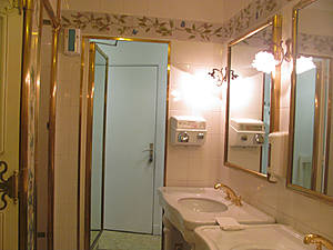 Мне было всё очень интересно ( попаду ли я когда нибудь ещё сюда), и не было уголка куда бы я не забрела. Конечно зашла и в туалет. Он был в бело — золотом цвете. Золотые краны, рамки зеркал, белоснежные раковины, двери. Ни соринки, ни пылинки, а сиденье унитаза при нажатии на кнопочку начинает вращаться, при этом выдвигается какой то механизм над сиденьем из его льётся водичка и тут же губкой протирается насухо. Ну очень интересно, я минут 5 игралась с этим приспрсоблением. Вот в туалете, камер не заметила, и быстренько сняла всю красоту. На выходе из игровых залов, прошла в фойе Оперы, декорированное в красно золотых цветах. Сам зал Оперы на жаль был закрыт. Моя экскурсия закончилась. С двух часов приходят посетители играть, а с 9 вечера действует дресс-код, уж не знаю работают ли в это время залы для бедных. Я решила прийти сюда часов в 6 вечера. Моя цель приобрести на память игровую фишку, как сувенир.