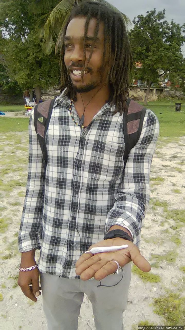 На этом же пляже моё внимание привлёк парень-растаман, отбивавший на камаджане африканскую мелодию. Рядом сидела девушка и делала запись музыки. Парень охотно дал мне интервью, в котором рассказал, что это его собственное произведение и что он стремится стать таким известным, как его кумир Боб Марли.