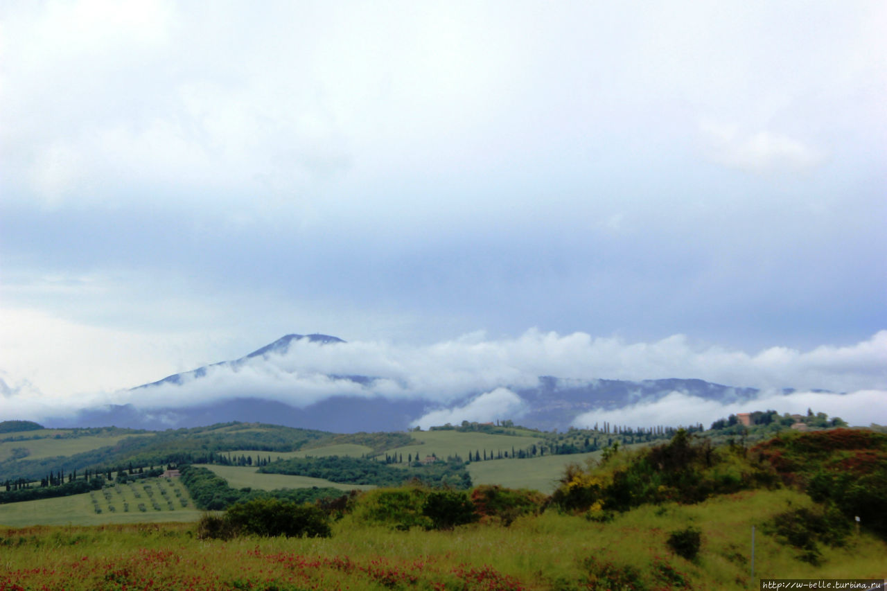 Возвращаемся в отель, над полями туман, очень красиво, как подушки перьевые. Амиата опять собрала около себя тучки с облаками, клубится молоком.