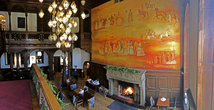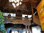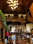 Ресторан кардинально по стилю отличается от каминного зала (вот она эклектика и внутри). Здесь вместо деревянной резьбы мы на стенах видим гипсовую лепнину...