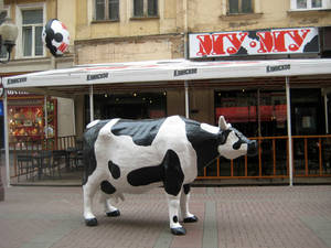 Потом я увидела "Му-Му" на Старом Арбате, побывала и там, (при входе в это кафе нас приветсвует статуя большой пятнистой коровы — символа кафе).