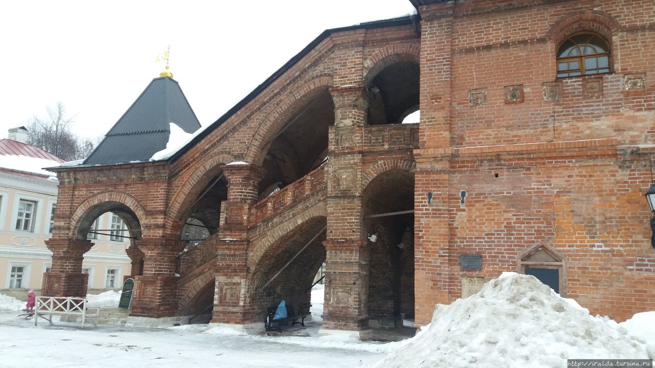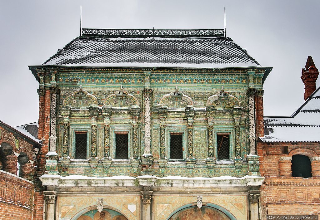 На подворье эффектно возвышается Успенский собор XVII века с черными главками-луковичками из кирпича, волшебный Теремок, украшенный двумя тысячами нарядных изразцов. Его архитекторами стали выдающийся русский зодчий Осип Старцев и каменных дел мастер Ларион Ковалёв.