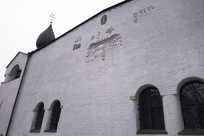 Если удастся заглянуть внутрь, то на алтарной апсиде обратите внимание на закладную доску с информацией когда и в чьем присутствии был заложен собор. Фасады украшены только рельефными клеймами, выполненными по проекту С.Т. Конёнкова, на них изображено Распятие и Небесный Иерусалим. К основной части собора примыкает обширная трапезная, использовавшаяся не только для богослужений, но и для духовно-просветительских бесед. С запада находятся две звонницы с широкими арочными проемами, каждая из которых увенчана вытянутой главой. Также на западном фасаде расположена мозаичная икона Спаса Нерукотворного, выполненная М.В. Нестеровым, расписавшим большую часть храма изнутри.