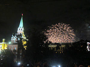 Через несколько десятков секунд случилось то, что окончательно выбило нас из состояния равновесия. За стеной кремля начался праздничный салют. Разноцветные шары исчезали в небе и оставляли неизгладимое впечатление в нашей памяти.