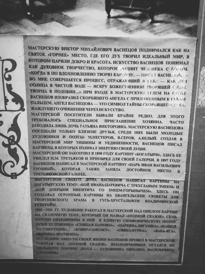 Во время посещения музея Васнецова в Москве, я выпала из нынешней реальности и с головой окунулась в ту самую, которой пропитана земля русская была всегда, испокон веков. Поэтому считаю, что слова великого поэта «Там русский дух, там Русью пахнет» подошли бы в первую очередь дому-музею Васнецова. Конечно, очевидно, что в нашей стране нет ни одного, кто не видел и не восхищался бы полотнами этого живописца... Мы все с молоком матери впитали русские сказки, чьи персонажи глядят на своих потомков с живых и по-детски искренних картин Васнецова – настоящие богатыри, грустная Аленушка, храбрый Иван-царевич, такая суровая Несмеяна, прекрасная царевна Лягушка, призрачная баба Яга и другие герои, горячо любимых нами с самой колыбели. Именно Васнецову удалось оживить взмахом кисти эти образы настолько реалистично, что кажется, они вот здесь, рядом с тобой, как живые люди.