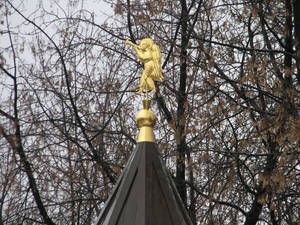 При выходе с подворья обратила на себя внимание башня с ангелом на крыше. Ангел с дудочкой, наверное ангел хранитель, а дудочка нужна , чтобы предупреждать о напастях.