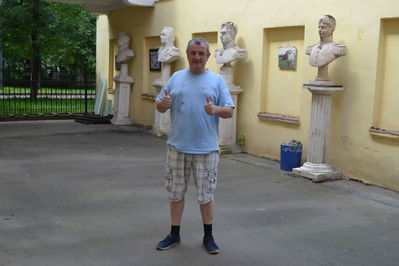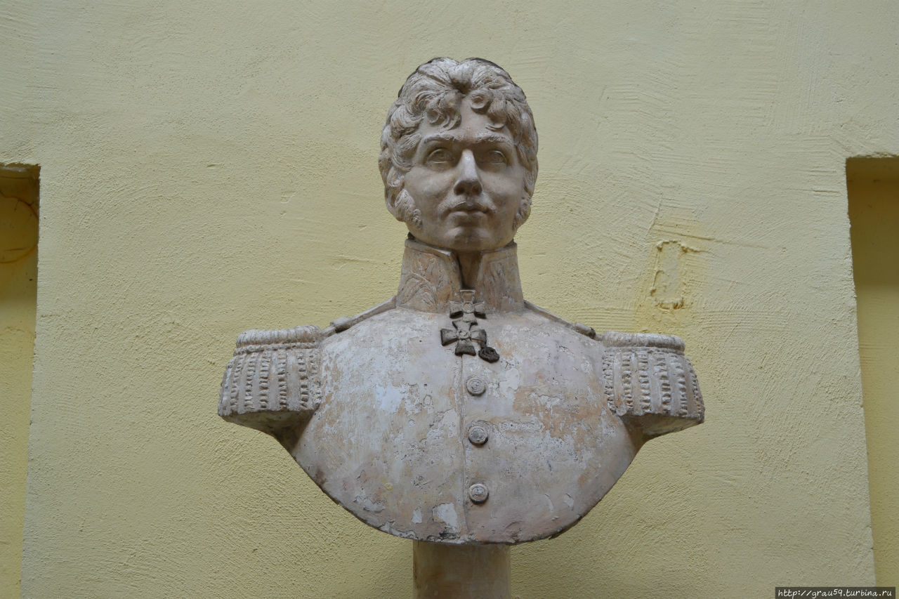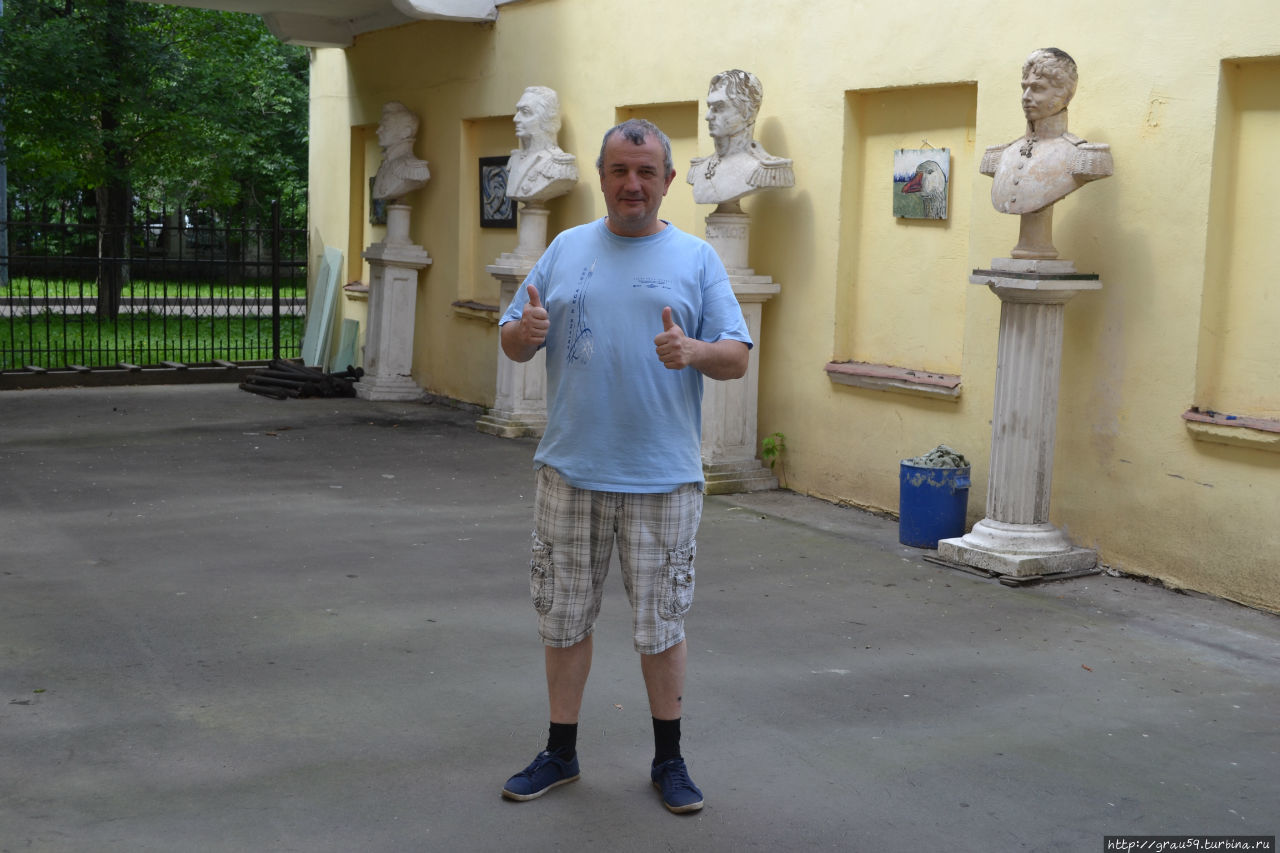 и сразу стали видны скульптуры разных размеров и обличий перед домом. Часть их располагалась прямо на газоне, часть в открытом стеклянном шкафу. Удивительно, что безо всякой охраны и сигнализации скульптуры спокойно существуют во дворе и вандалы обходят их стороной.За углом здания расположились четыре бюста героям Отечественной войны 1812 года,