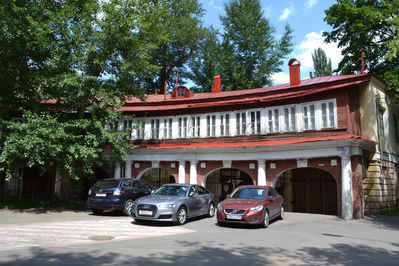 Имеются во дворе два примечательных здания в виде циркумференций, низких полукруглых строений служебного назначения, которые обычно отделяли парадный двор от улицы. В них раньше располагались конюшни и были они одноэтажными, после революции где-то в тридцатых годах прошлого века, над ними были пристроены еще по одному этажу. Такими вещами в Москве советского периода баловались частенько, невзирая на первоначальную этажность. При этом одна из конюшен внешне выглядит переделанной под гаражи, закрытые решетками.