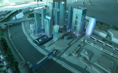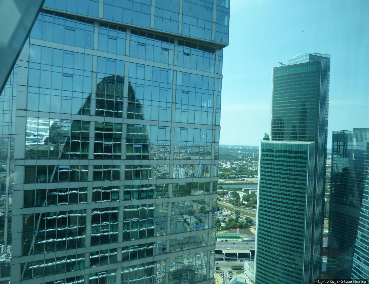 Высота башни — более 230 метров. Всего в ней 60 этажей; смотровая площадка расположена на 58 этаже. В помещении представлены также макеты и схемы.