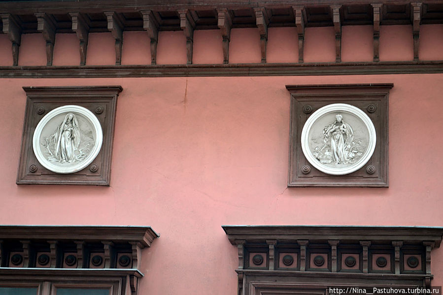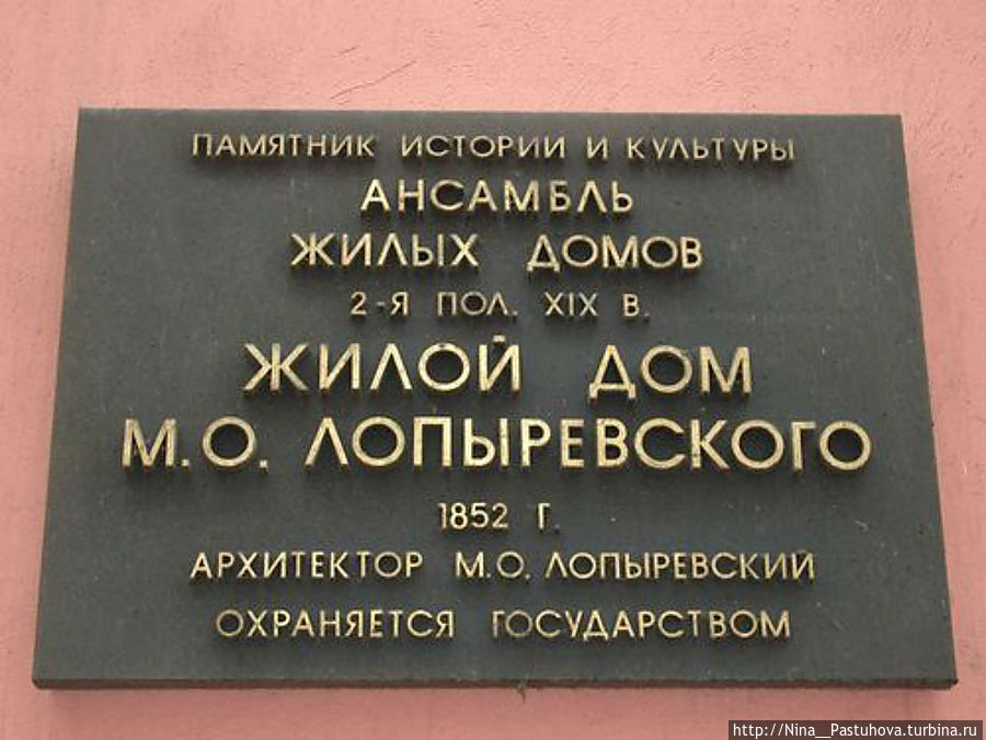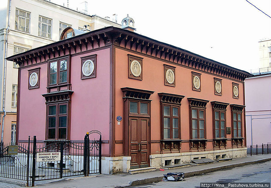 Прибежали рано, ещё не пускали даже в фойе, поэтому было время заметить этот яркий особняк с медальонами в Калошином переулке. Деревянный, одноэтажный дом возведен был в 1852 году архитектором Михаилом Лопыревским для себя.