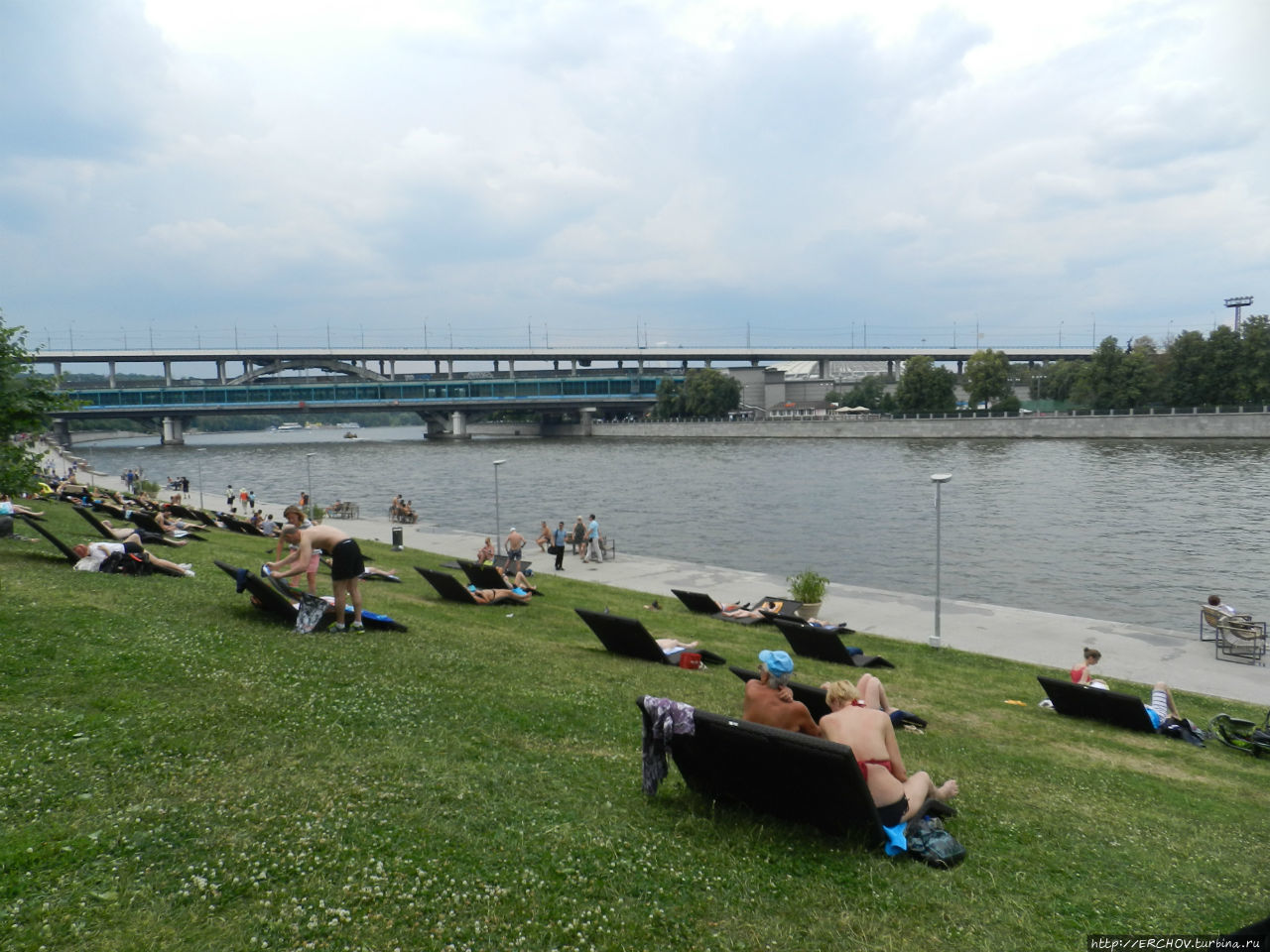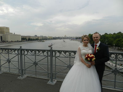 Гуляем по Пушкинской набережной. Именно здесь расположен театр Стаса Намина. Театральные музыканты вышли на улицу, и играют для москвичей что-то похожее на джаз. Надеюсь, Родину они не продадут... Атмосфера на Пушкинской набережной несколько другая, нежели на Андреевской. Люди гуляют, наслаждаясь хорошей погодой и самим городом. Возле Андреевского моста проходят массовые танцы. Приятно видеть в своём городе иностранных туристов. Завершая прогулку поднимаемся на мост и движемся по нему в сторону метро Парк культуры. Когда я увидел ещё одну пару молодожёнов, мне невольно вспомнился Павел и его заметки: