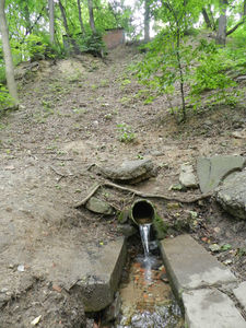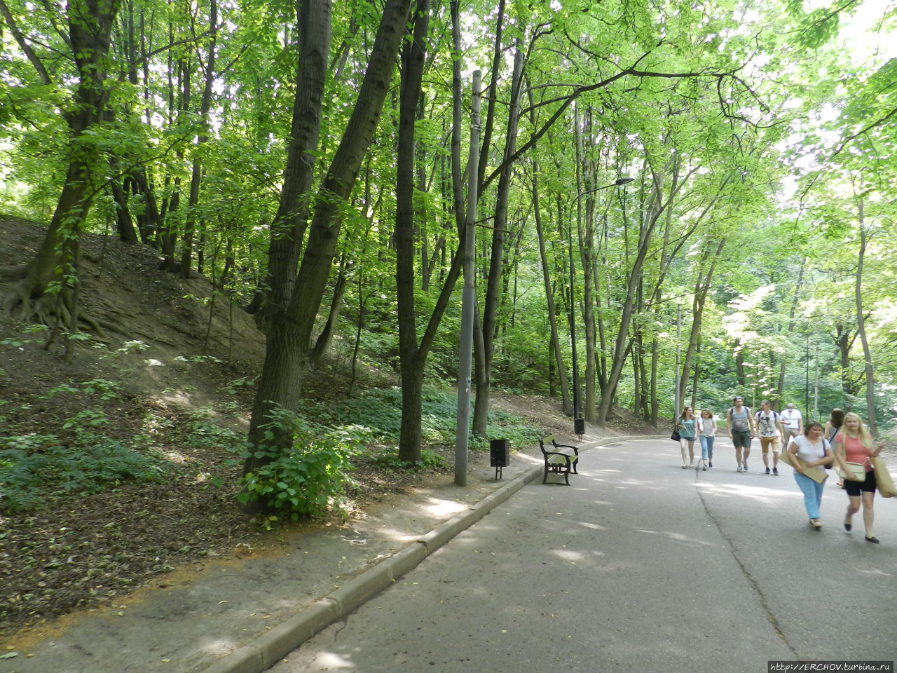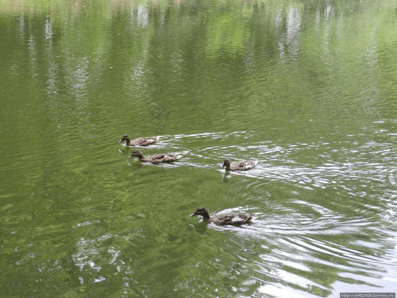 В свою очередь благодарный парк дарит нам для наблюдений следующую сценку. Птица возле родника неспешно пьёт воду, купается, а после приводит в порядок свои пёрышки. Рядом из горы выходит ещё один родник, поток воды которого чуть более мощный. Ручейки по своим руслам устремляются вниз к Москва-реке. В какой-то момент они соединяются. Но хитрый человек, не дав ручейкам портить асфальт, перехватил потоки и спрятал их в коллектор. Мы же выходим на Андреевскую набережную. Жарко. Народ расслабляется возле воды, но купаться здесь запрещено. Мама утка рассекая волну, уводит куда-то по реке своих утят. Скользят по воде прогулочные кораблики. Мы же снова поднимаемся в парк, желая вновь окунуться в его романтическую тень.