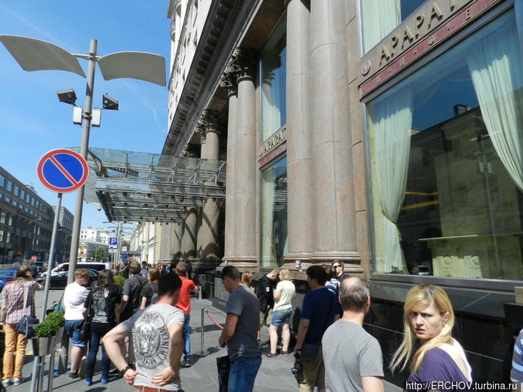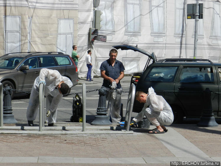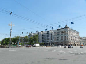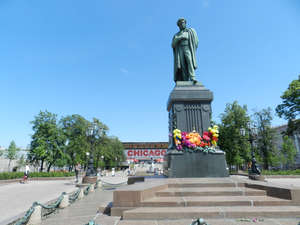 Времена меняются — возле подземного перехода теперь часто можно увидеть вело такси. Пушкинская площадь, воскресенье — машин почти нет. По подземному переходу выходим на другую сторону. Памятник А.С.Пушкину Думаю, здесь комментарии не нужны. Фонтаны перед кинотеатром Россия. Кинотеатр Россия. Обходим кинотеатр справа Здесь мы видим, что у троллейбуса отлетел рог. Движемся дальше в сторону Страстного бульвара На Большую Дмитровку нам не нужно, заходим на бульвар. Здесь видим памятник Твардовскому Сам бульвар просто утопает в зелени Многие москвичи, уезжая в субботу и в воскресенье на дачу, думают, что они таким образом спасаются от людской суеты. Это не так, ибо это наоборот город спасается от обилия вечно спешащего делового народа. Сегодны на Страстном бульваре проходил шахматный турнир. Здесь на бульваре власти города оборудовали детскую площадку. Памятник композитору Рахманинову Одно из старых зданий на ремонте. Приближаемся к Петровским воротам. Здесь Ю.В.Лужков установил памятник Владимиру Высоцкому. Две фотографии без комментариев. Уходим на ул. Петровка. Высоко-Петровский монастырь. Музей современного искусства Движемся по Петровке к центру города. За забором Высоко-Петровский монастырь. Улица Петровка. Здание Московской Городской Думы. На самой улице можно видеть теперь вот такие двери. Вот такие дворы. Столешников переулок (это давно уже пешеходная зона) На другой стороне музей ГУЛАГа Здание Прокуратуры России. Петровский пассаж. Сфотографировать что-либо нормально из-за припаркованных машин теперь тяжело. Петровка здесь на пересечении с ул. Кузнецкий мост заканчивается. Здесь за ЦУМом проходит праздник, посвящённый Дню защиты детей. Движемся далее по Кузнецкому мосту, и встречаем здесь героев сказки К.Чуковского — доктора Айболита и его верную обезьянку Чи-Чи-Чи. Поворачиваем на ул. Неглинка, подходим к отелю Арарат Хайят. Здесь толпится народ, они ждут выхода из гостиницы легендарного Оззи Осборна. Появления легенды мы ждать не будем, движемся дальше и выходим на ул. Охотный ряд. Переходим по подземному переходу и идём в сторону м. Площадь Революции. Здесь стоит отель Метрополь (кто здесь только не останавливался...) Вновь отстроенная гостиница Москва. На другой стороне Охотного ряда Большой театр, а здесь можно видеть кусочек Китай-городской стены. Возле метро Площадь Революции по выходным проводят концерты, рядом сувенирный рынок. Вот так, незаметно мы пришли к метро Площадь Революции.