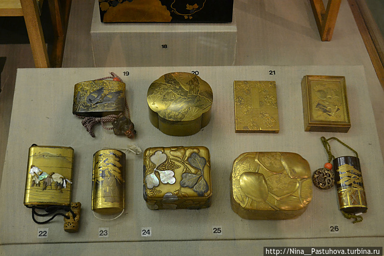 Среди экспонируемых образцов – шкатулки, курильницы, миниатюрные домашние алтари дзуси, чайницы, столик для чтения и письма бундай, футляр для свитков, короб для еды, курительный прибор, носимые на поясе портативные разборные коробочки для печатей и медикаментов.