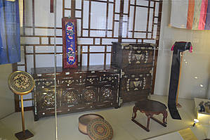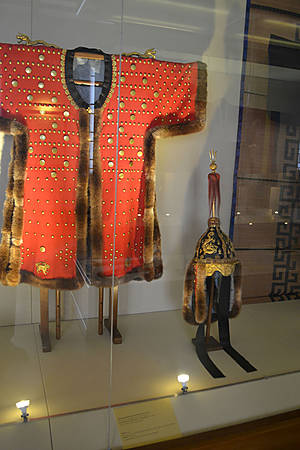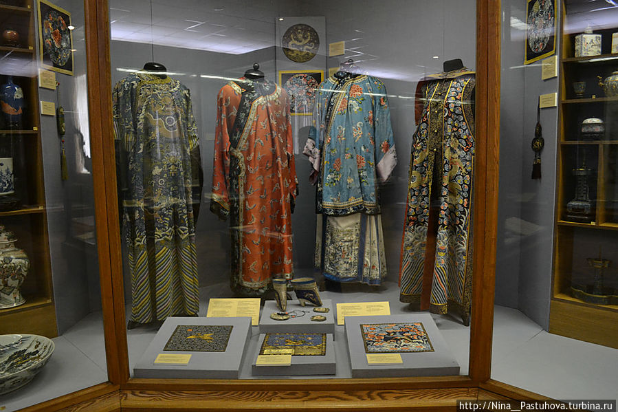 Один из разделов посвящён китайскому официальному костюму. Здесь представлены халаты, в декоре которых отражалась космологическая символика, квадратные буфаны – знаки отличия чиновников по рангам, выставлены женские китайские и маньчжурские кофты, созданные в технике гобеленного ткачества кэсы или украшенные сложной вышивкой, называемой в Китае сюхуа (живопись иглой).