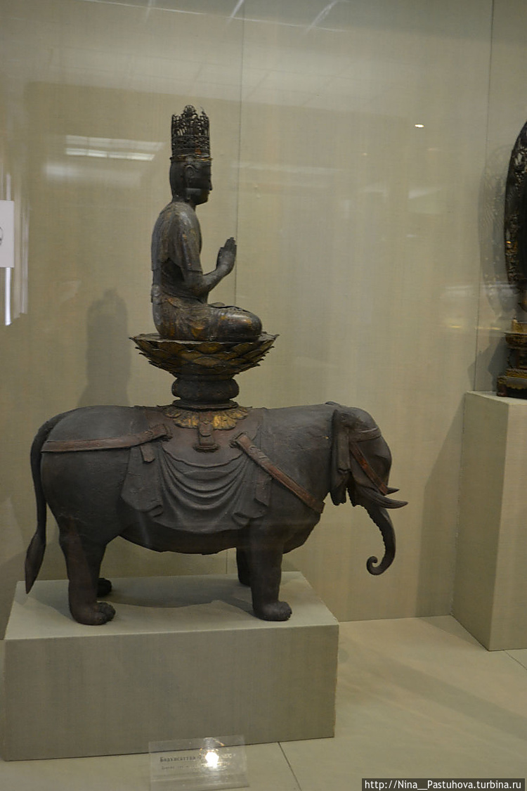 Экспозицию открывают уникальные памятники буддийской деревянной пластики 12-15 вв., среди которых подлинными шедеврами являются изображение бодхисаттвы Фугэна на слоне (12 в.) и статуя Будды Амида (13 в.). Они демонстрируют стиль, оформившийся в рамках буддийского канона и ставший воплощением эстетических идеалов аристократии. Для него характерны культ утонченного изящества и несколько женственной грации, камерность образов, превращавших объект религиозного поклонения в предмет любования.
