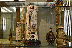 В двух витринах богато представлена коллекция миниатюрной пластики – около двухсот нэцкэ и окимоно, выполненных первоклассными резчиками своего времени. Обширный круг сюжетов проливает свет едва ли не на все аспекты жизни горожанина и круг его интересов: мифологические и фольклорно-сказочные персонажи соседствуют с образами легендарных героев и незатейливыми бытовыми зарисовками, фигурки животных – с изображениями растений, а бродячие комедианты – с масками классического театра Но.
