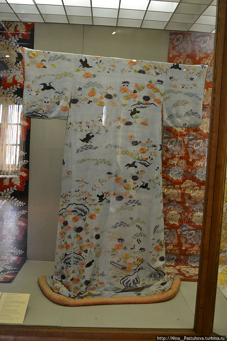Период Эдо (1603 – 1868) – время формирования общенационального типа одежды, ныне объединенного одним словом "кимоно", в буквальном смысле "вещь, которую носят". Это широкие и длинные халаты прямого покроя, которые отличаются лишь длиной рукавов, сшитых из прямоугольных полотнищ стандартных размеров. На них орнаменты заимствованные из живописи (птицы, цветы, растения, пейзажные композиции), каллиграфические надписи, а также композиции, навеянные образами классической поэзии, и благопожелательные сюжеты. Экспозиция знакомит с основными разновидностями кимоно: косодэ ("малый рукав"), фурисодэ ("длинный качающийся, струящийся рукав"), — с вошедшими в моду в 18 в. широкими поясами оби. Украшенные замысловатым тканым узором, росписью или вышивкой, они отмечены нарядной праздничностью, в которой с наибольшей наглядностью проявился жизнеутверждающий облик средневековой культуры, сохраняющийся в традиционном костюме по сей день.