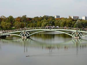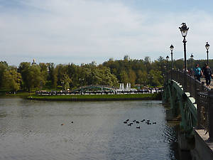 Вот и входные ворота. Парк и усадьба общедоступные, платить не надо. А когда вошли в парк, сердце замерло в восторге от красоты! Звуки музыки шли от музыкального огромного, поющего фонтана, струи которого то поднимались ввысь, то падали с шумом к воде. Фонтан построен на острове в центре большого пруда. Вообще в пределах огромного парка Царицыно целая водная система -. Верхний Царицынский пруд, Шипиловский и Борисовский образуют самый большой в столице каскад прудов.